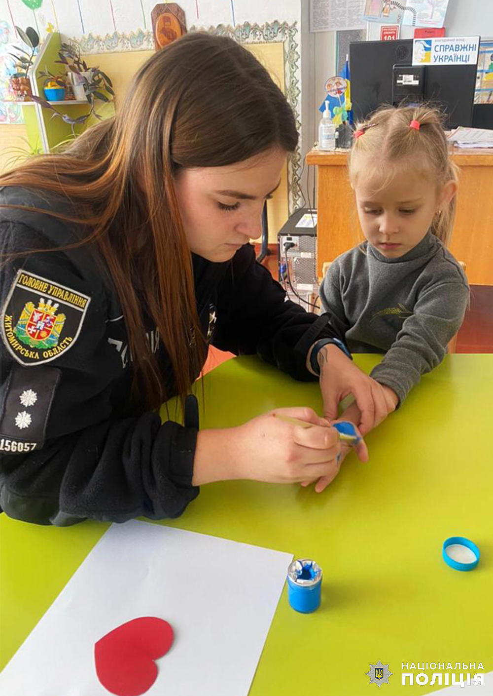 Разом із ювенальною інспекторкою Бердичівського райвідділу поліції діти виготовляли малюнки своїми долоньками у патріотичних кольорах. А потім — старанно виводили на них слова щирих побажань і вдячності. Творчий процес малювання захопив дітей, адже у кожному малюнку — частинка серця і душі. У кожному слові — любов та підтримка. У кожній роботі — надія на Перемогу.