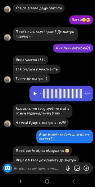 – Ми переписувалися в інстаграм, моя подруга теж недавно стала мамою і ми часто ділимося новим досвідом – материнством. Цього разу ми говорили про хрестини, вона запитала, чи готуємось ми до цієї події і я відповіла, що так. На цьому ми завершили листування, а вже через декілька годин вона попросила позичити їй гроші. Мене це насторожило, адже ми одночасно отримуємо фінансову допомогу по догляду за дитиною, тому я запитала, на що саме їй потрібні гроші. Вона відповіла загадково, мовляв – замовлю одну річ, а потім скину відео. Я повірила, адже ми, жінки, такі – любимо секрети…