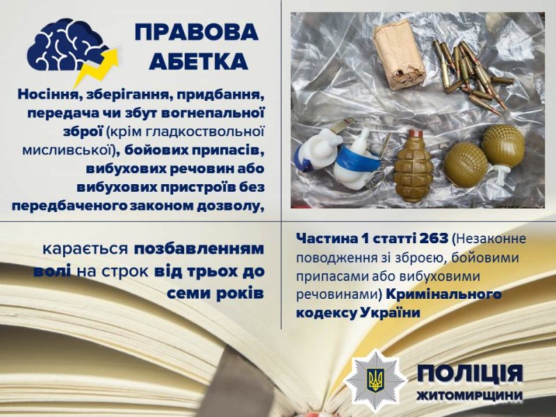 Згідно з чинним законодавством носіння, зберігання, придбання, передача чи збут вогнепальної зброї (крім гладкоствольної мисливської), бойових припасів, вибухових речовин або вибухових пристроїв без передбаченого законом дозволу карається позбавленням волі на строк від 3 до 7 років.