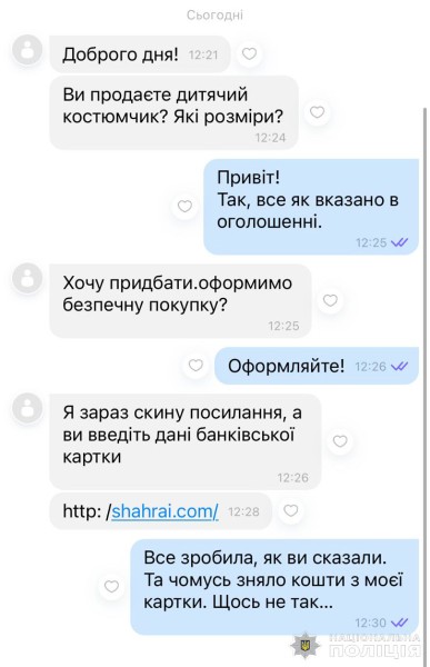 18 жовтня до поліції надійшло звернення 31-річної жінки з повідомленням про зняття коштів з її банківської картки. Передувало цьому розміщення нею оголошення про продаж речей на одному з торгівельних онлайн-майданчиків та «угода про безпечну покупку».