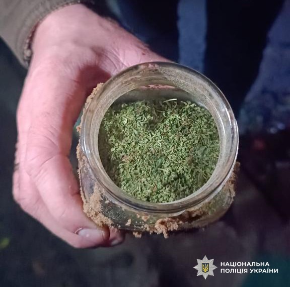 Під час слідчих дій правоохоронці виявили скляну банку з подрібненою сумішшю зеленого кольору, яку агресор сховав на подвір’ї в дитячій пісочниці, а за кілька метрів – кущі конопель. Дебошир розповів, що все зберігав для власних потреб.
