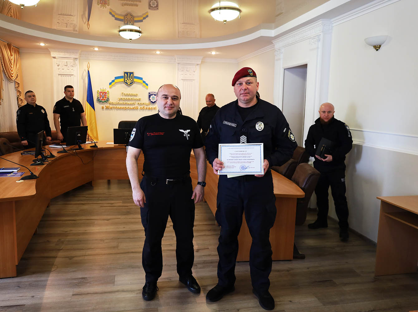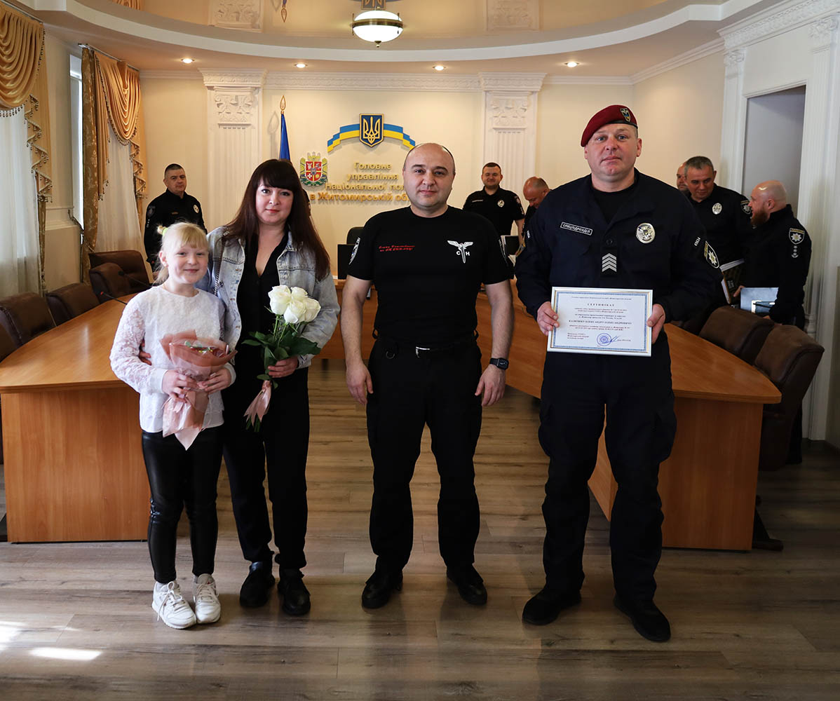При виконанні службового обов’язку, 27 лютого 2022 року, на території Малинської громади було поранено спецпризначенця, поліцейського роти поліції особливого призначення ГУНП Олександра Калитюка. Про ті події поліцейський згадує лише в колі своєї родини, яка завжди поруч. Сьогодні вони разом розділили радість від нагороди: сертифікат на квартиру у м. Житомирі, виділену рішенням виконавчого комітету Житомирської міської ради, вручив керівник поліції області у присутності членів колегії ГУНП.