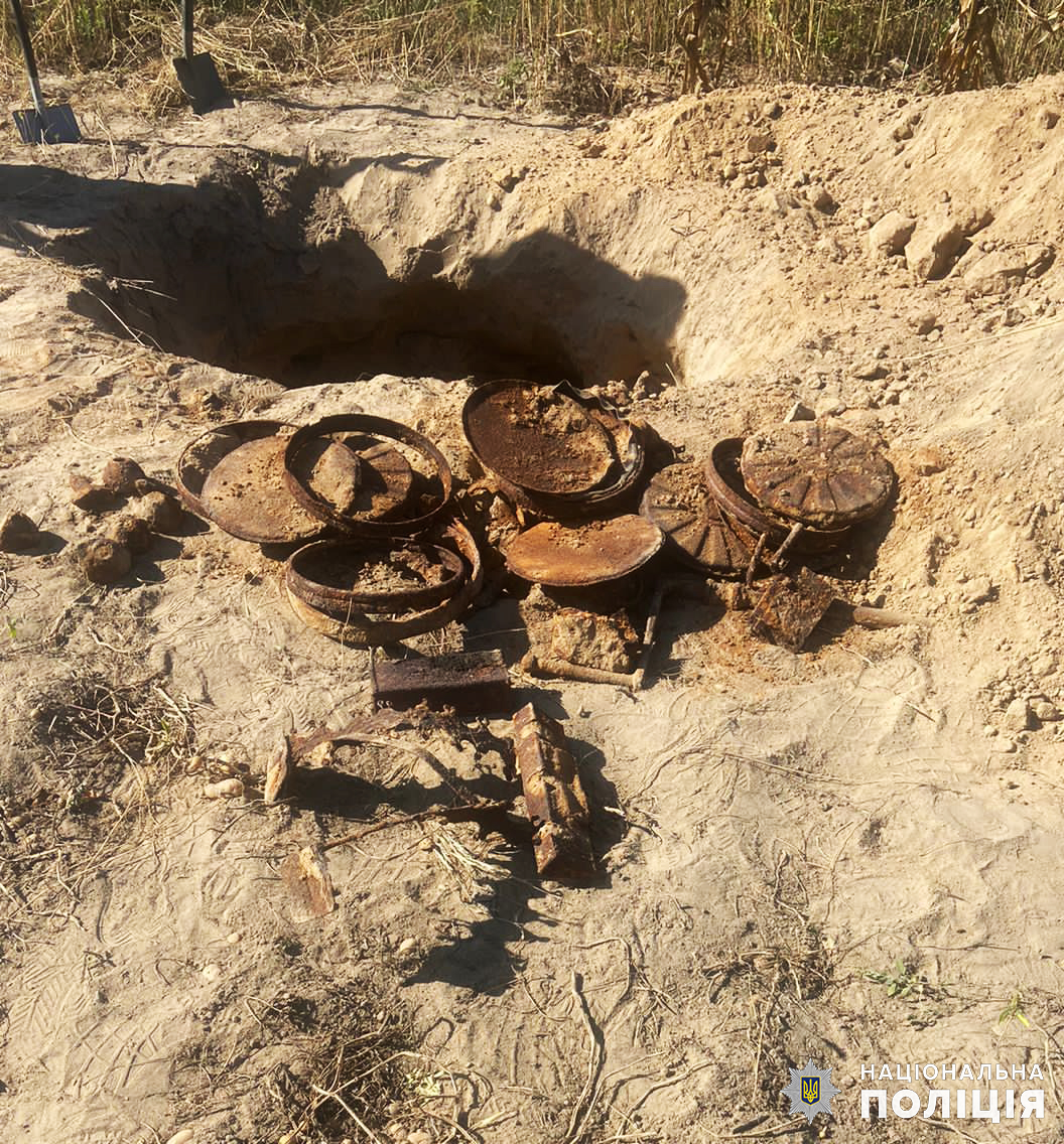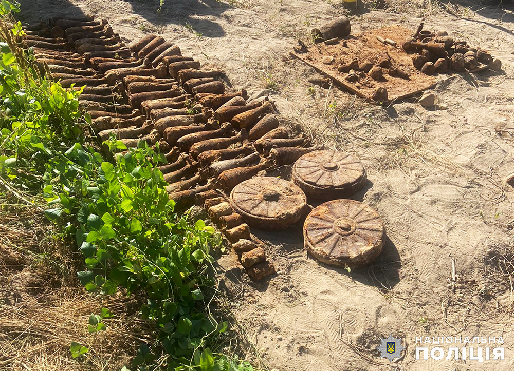 Правоохоронці встановили, що неподалік від житлового будинку, на відстані близько 15 метрів, у землі схоронені боєприпаси: 82 мінометні міни 82 калібру, 3 протитанкові міни та 8 гранат.