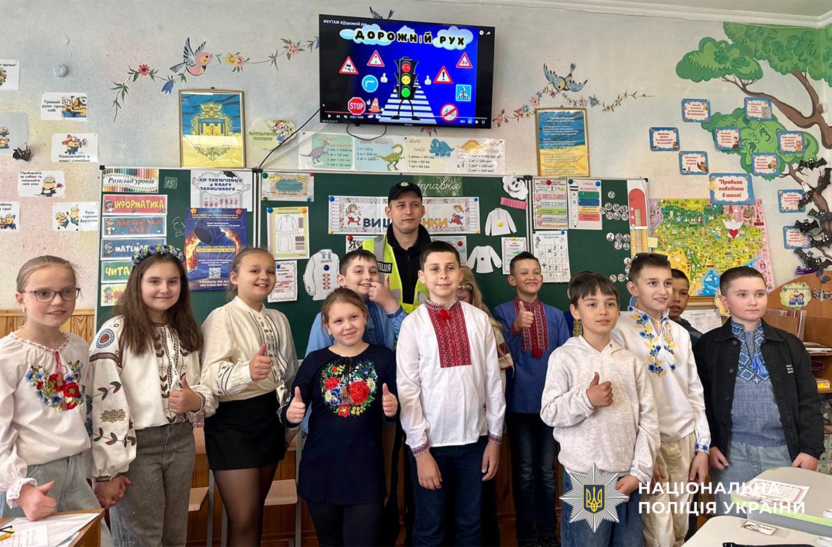 Правоохоронці розповіли дітям про основні правила дорожнього руху, зокрема, учні повторили, як безпечно переходити дорогу на шляху до свого ліцею та додому. Крім того, темою обговорення стали правила їзди на велосипедах, самокатах та бордах.