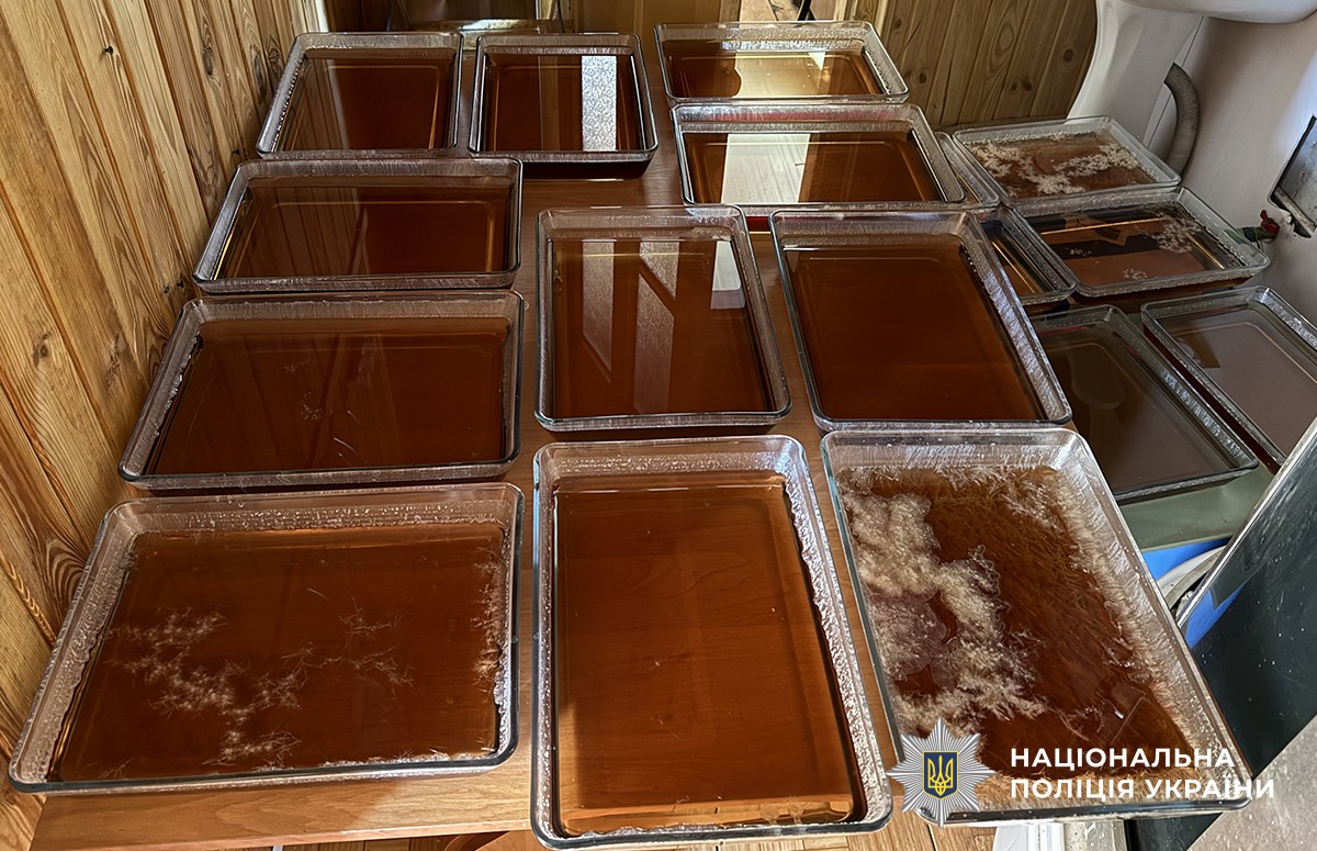 Під час обшуків правоохоронці вилучили близько 7,5 кг альфа-PVP, а також пакунки з мефедроном, метадоном та канабісом, галюциногенні гриби, прекурсори, спеціальний посуд, лабораторне та холодильне обладнання, пакувальні матеріали, електронні ваги, чорнові записи та інші докази протиправної діяльності. Крім того, вилучили у фігурантів засоби зв’язку, комп’ютерну техніку, транспортні засоби, банківські картки.