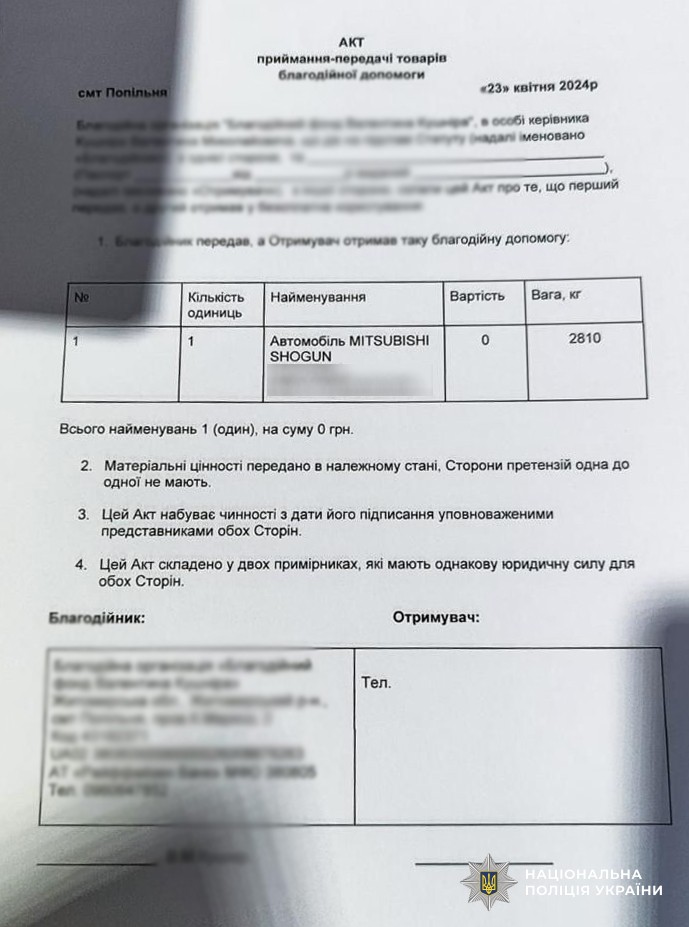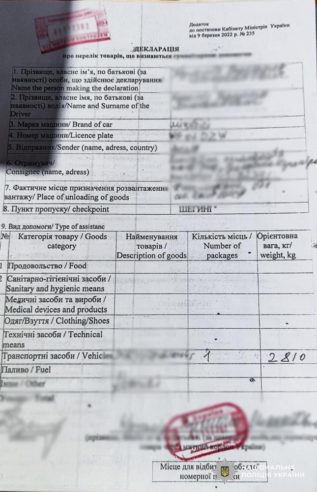 Слідчі поліції перевіряли причетність чоловіка до збуту транспортних засобів, призначених для ЗСУ, третім особам. 23 квітня вони задокументували продаж ним чотирьох іномарок. Після отримання «благодійником» грошей поліцейські, за оперативного супроводу УСБУ в області, затримали його в порядку ст. 208 (Затримання уповноваженою службовою особою) КПК України.
