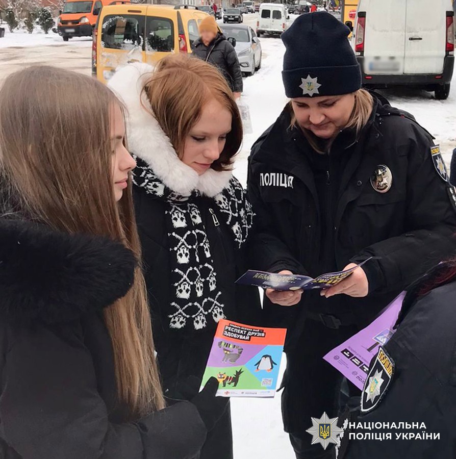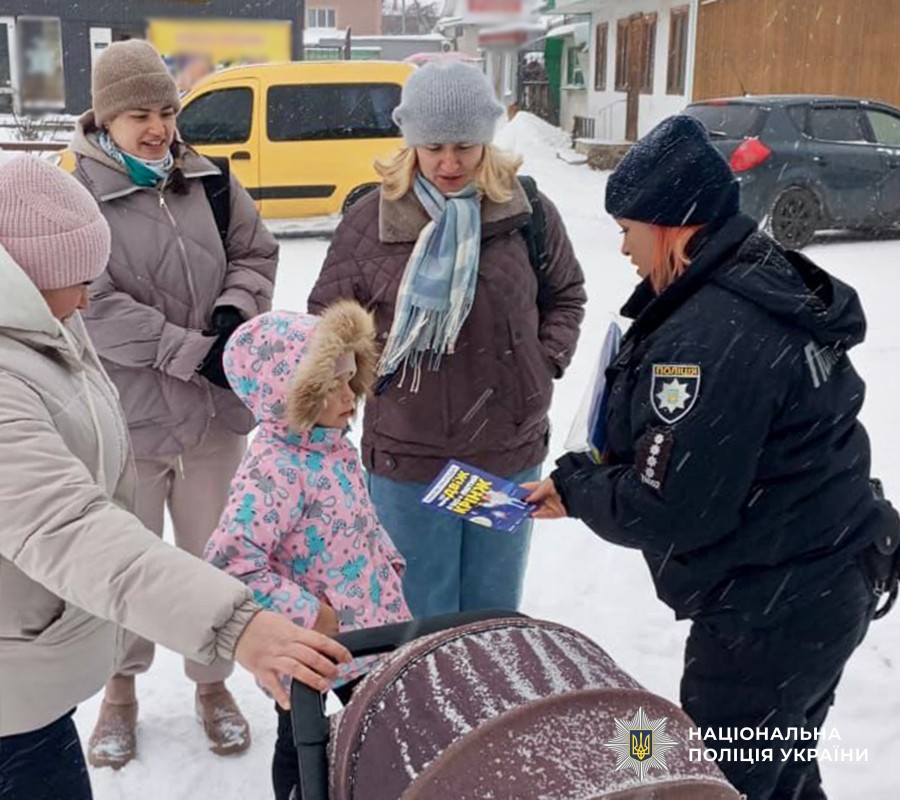 Окремо поліцейські наголосили батькам на необхідності контролювати дозвілля дітей та дбати про їх безпеку. Всім співрозмовникам вручили інформаційні матеріали з порадами, як уникнути травм у зимовий період.