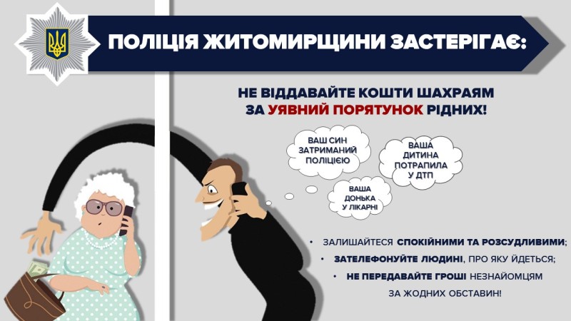 Водночас правоохоронці вкотре закликають жителів Житомирщини бути вкрай обережними у спілкуванні з незнайомцями, особливо якщо вони звертаються до вас у телефонному режимі, називаючись посадовцями, лікарями, соціальними працівниками, поліцейськими тощо.