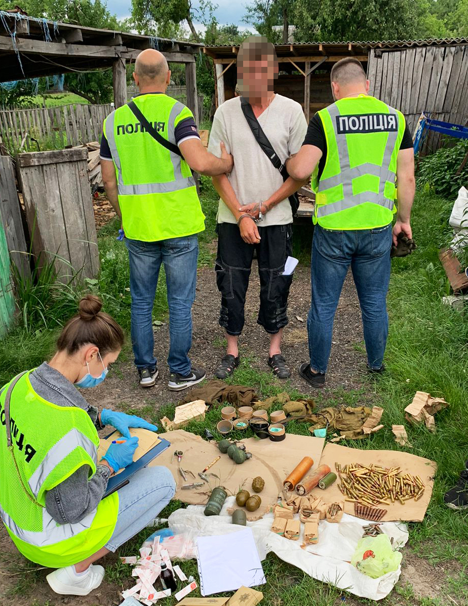 Під час обшуків на місці затримання та за місцем проживання підозрюваного вилучено більше як 10 гранат, майже 500 набоїв різного калібру, магазин до снайперської гвинтівки, артилерійський порох, підривачі та інше.