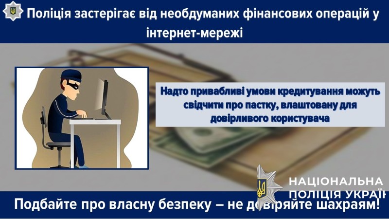 Так, у березні житель Запоріжжя, натрапивши на оголошення про кредит, спокусився привабливими умовами й одразу ж сконтактував з «менеджеркою». Співрозмовниця розповіла про процедуру отримання позики, вказавши, що для цього необхідно сплатити тисячу гривень за «оформлення». Чоловік одразу ж погодився та виконав умову, однак ні бажаної позики, ні повернення власних грошей він так і не дочекався.