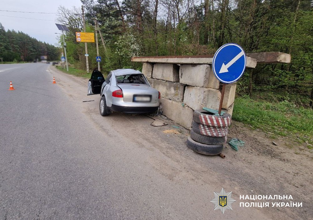 А вже близько 17:30 автотроща сталася на 5 км автодороги Житомир - Чернівці у селі Тетерівці. Попередньо, водій автомобіля «Audi», 24-річний житомирянин, допустив зіткнення з бетонною конструкцією.