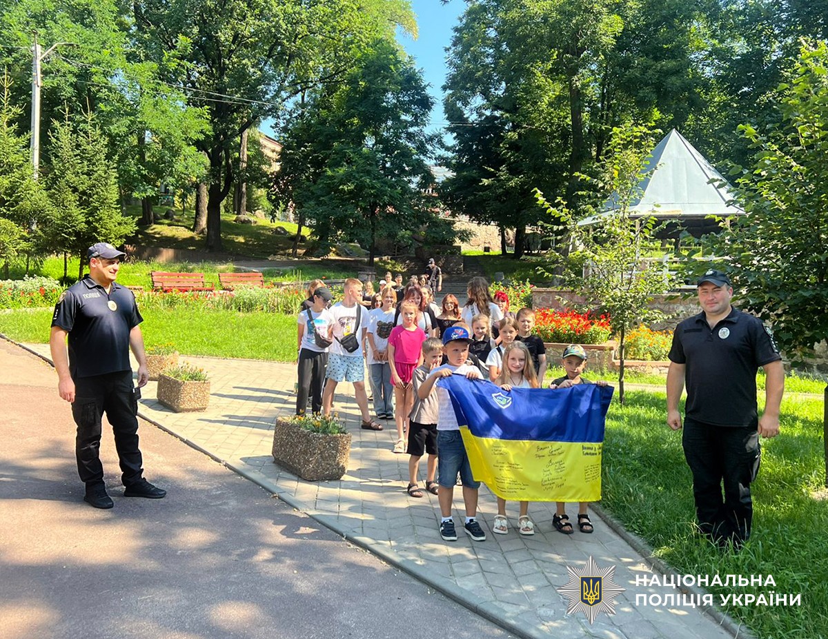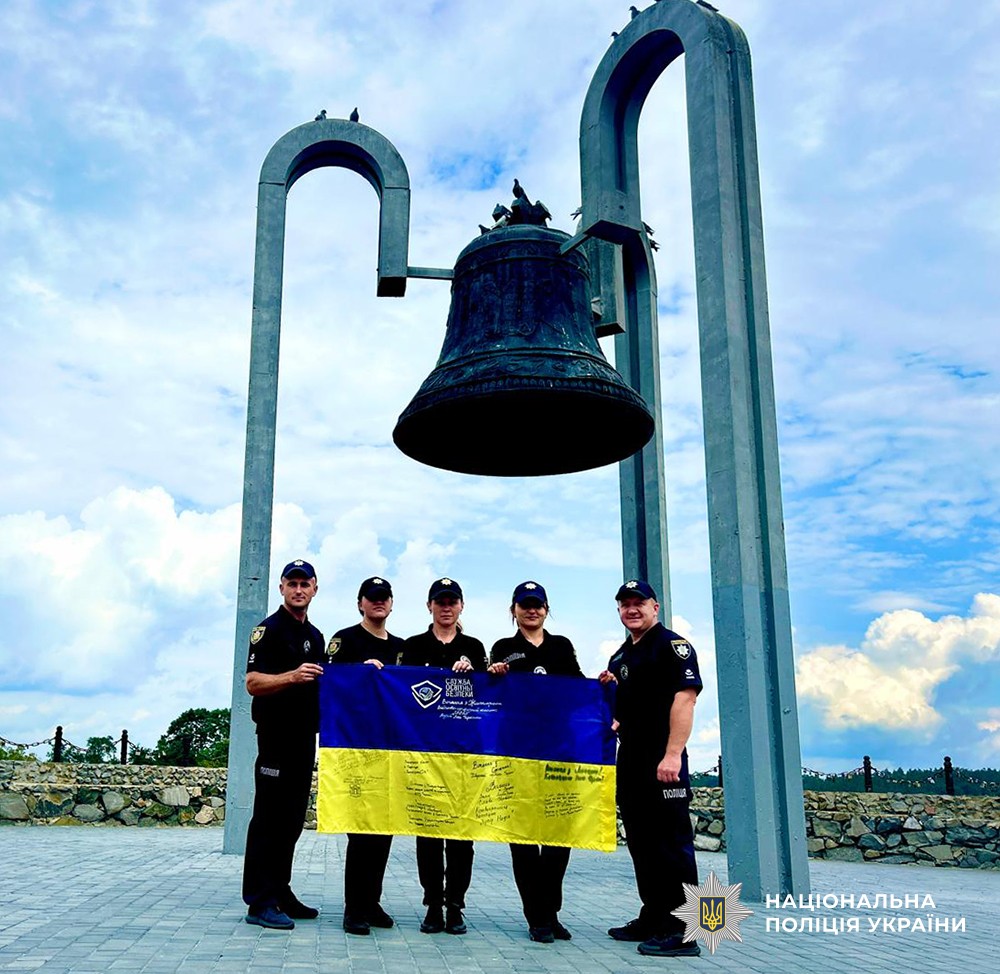 Національний Прапор України, що подорожує територією всієї нашої держави, поліцейські спільно з дітьми підписали у Коростені 5 серпня. Цей стяг збирає на собі відмітки з найвизначніших місць країни, передаючи частинку дитячої підтримки та вдячності військовим.