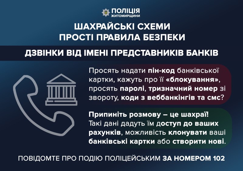 24 червня подібний дзвінок отримала жителька м. Бердичева. Незнайомець назвався працівником служби безпеки фінансової установи. Жінка виконала його вказівки, після чого втратила заощадження. Зрозумівши, що стала жертвою шахрайства, звернулася до поліції.