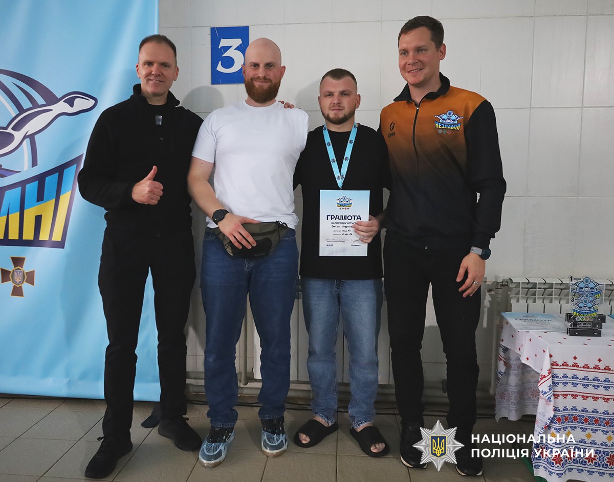 Правоохоронці з Житомирщини гідно представили область. Поліцейські Сергій Кисленко та Владислав Третʼяк взяли участь у запливі на дистанції 100 метрів. Окрім індивідуальних виступів, вони разом із спецпризначенцем Дмитром Предеіним та Євгеном Чорноштаном – ветераном війни, помічником начальника з питань ветеранської політики Житомирської академії поліції, сформували команду для участі в естафетному запливі.
