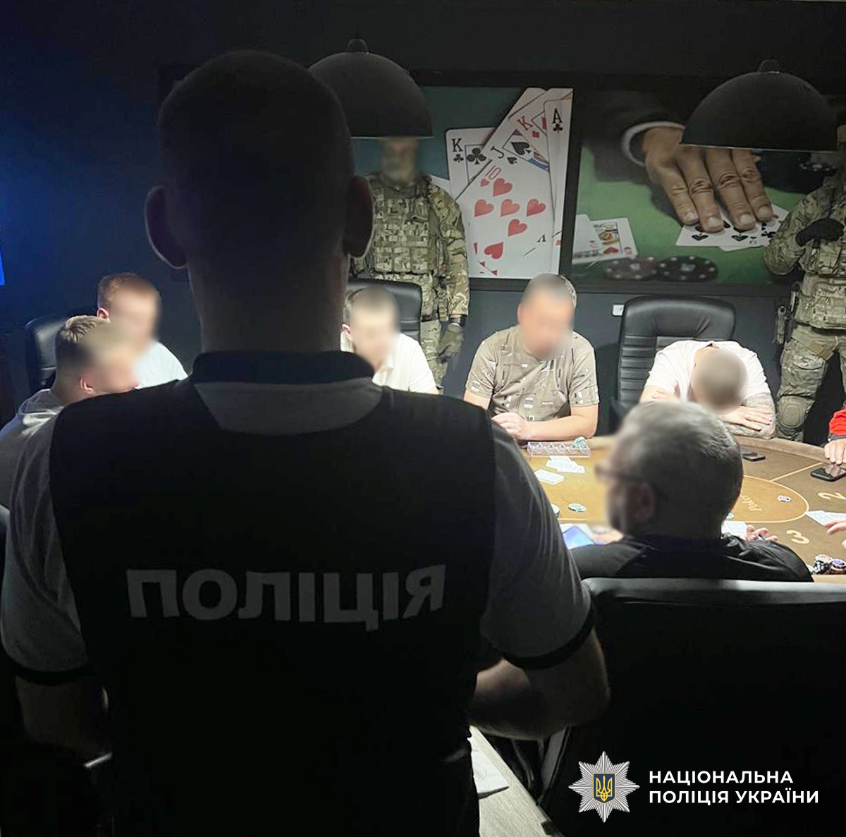 столи для гри у покер, готівку в доларах та гривнях, гральні карти, комп’ютерну техніку, банківські картки, чорнові записи та інше обладнання, яке використовували для функціонування підпільного закладу. На момент появи правоохоронців в залі перебувало до десяти гравців.