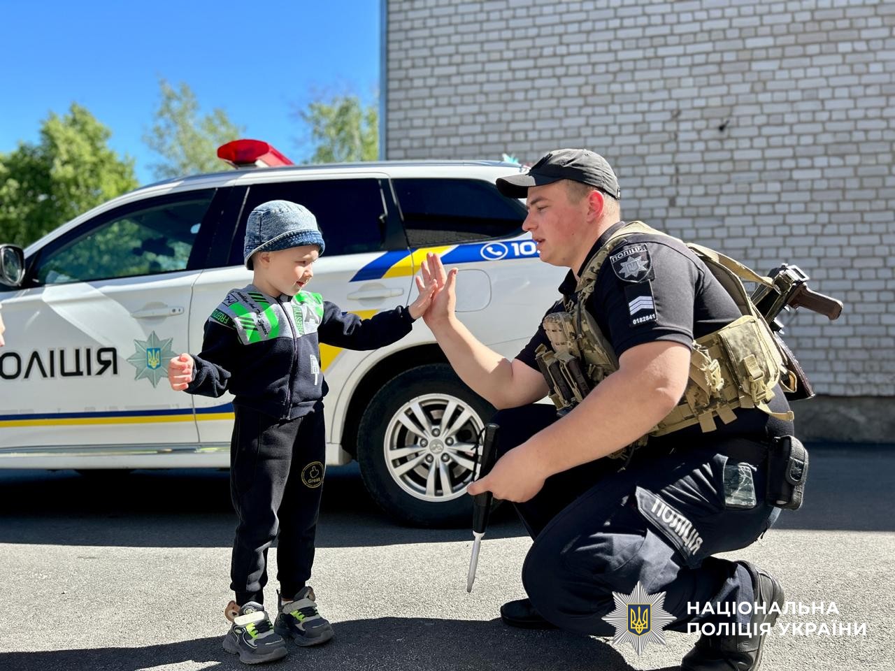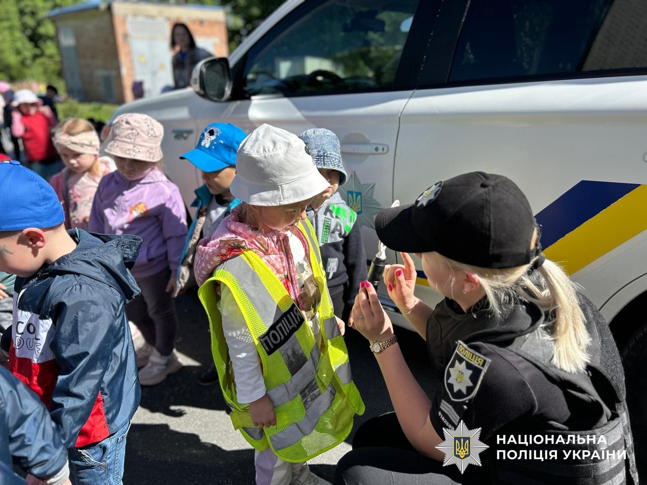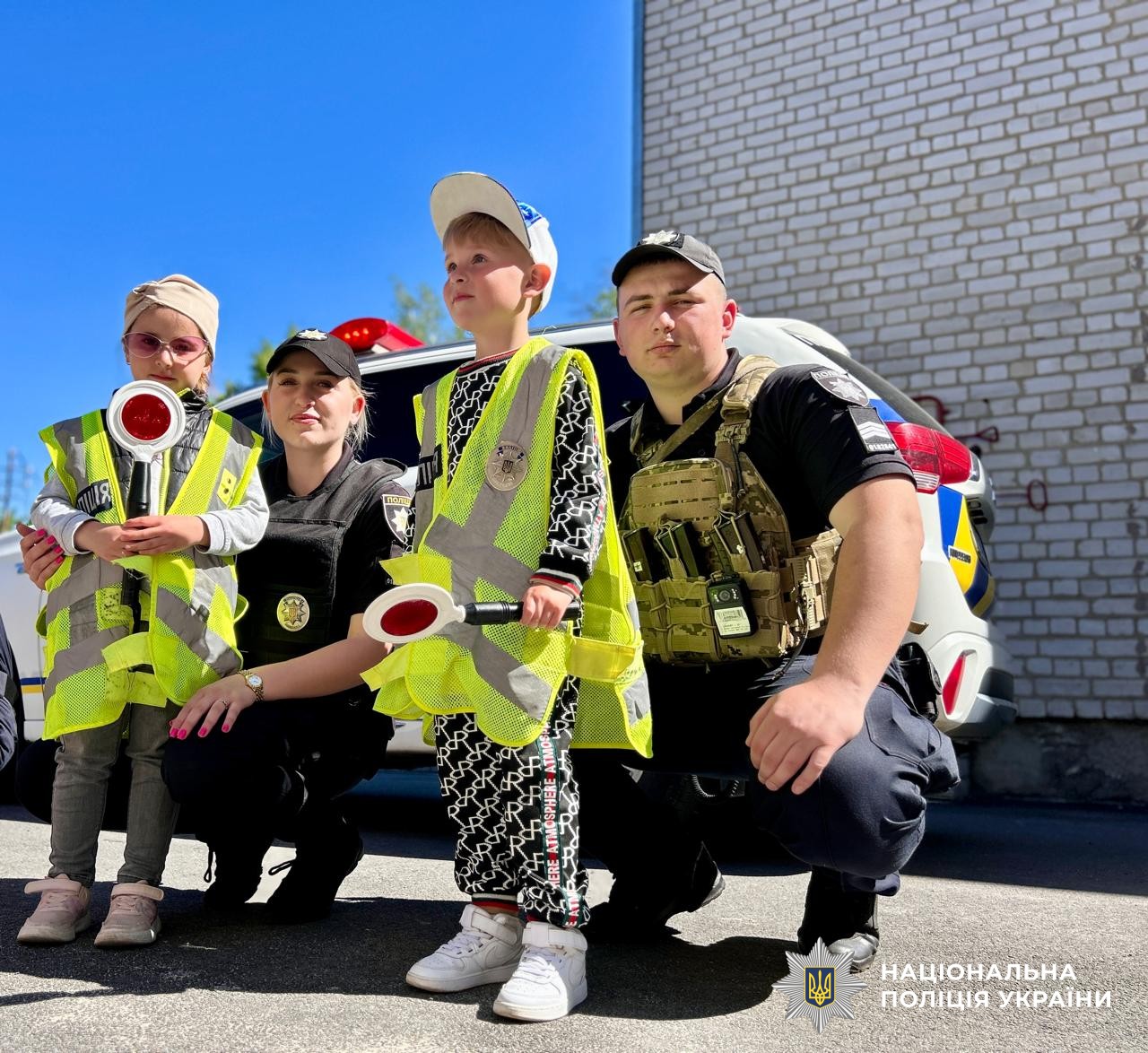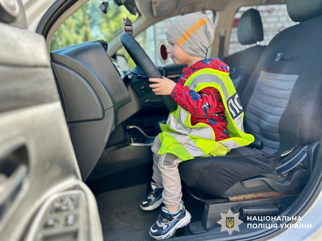 Згодом малюки розпитали поліцейських про їхню роботу, приміряли бронежилети, роздивились спеціальне обладнання та посиділи за кермом службового автотранспорту.