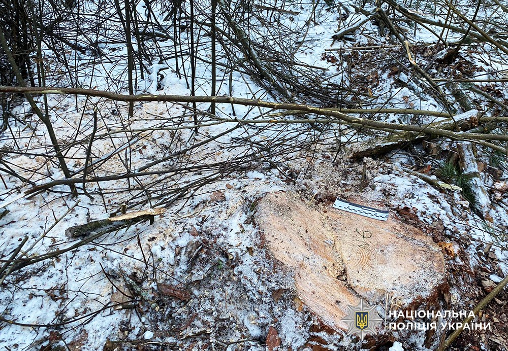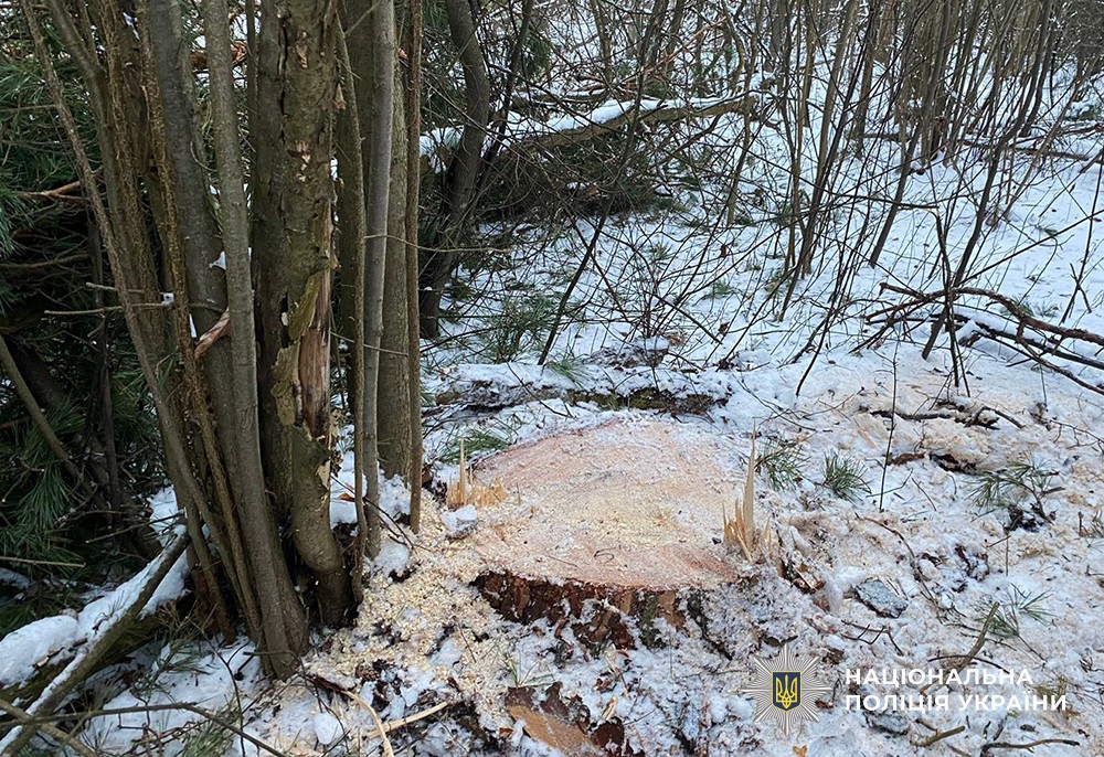 11 грудня до правоохоронців відділу поліції №2 (м. Коростишів) Житомирського райуправління надійшло повідомлення від працівників Кропивнянського лісгоспу про вирубані соснові дерева у лісовому масиві.