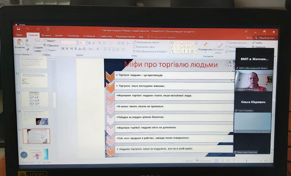 Начальник відділу міграційної поліції ГУНП в Житомирській області Максим Заярний в онлайн-режимі провів семінарське заняття на тему "Механізм організації роботи щодо попередження торгівлі людьми". Учасники розглянули проблематику виявлення злочинів у цій сфері під час активізації збройного наступу рф.