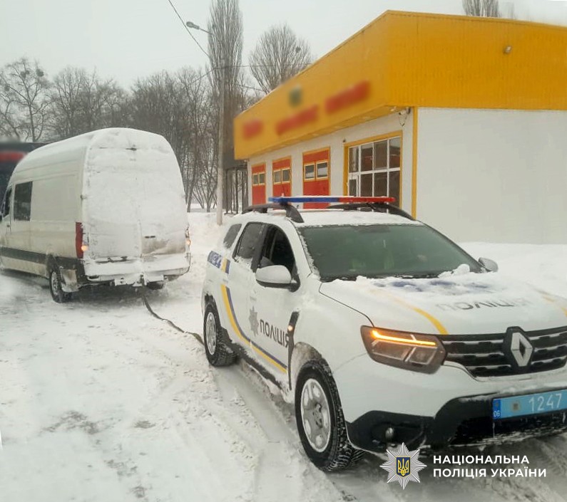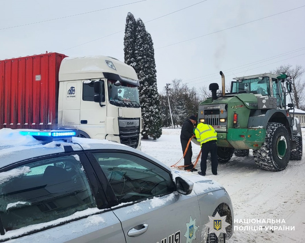 Поліцейські патрулюють автошляхи, контролюють рух транспорту на небезпечних ділянках та сприяють буксируванню автомобілів зі снігових пасток.