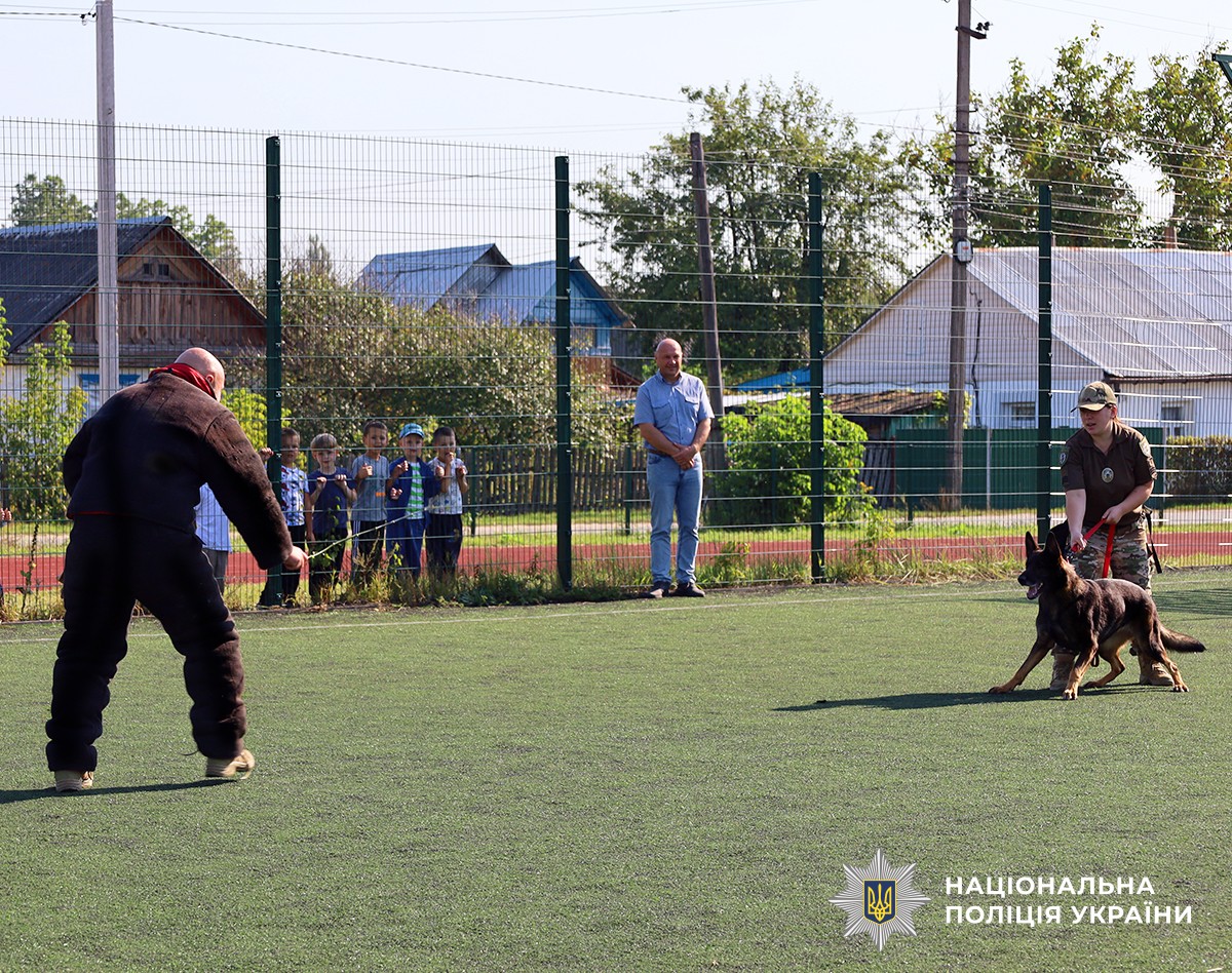 Кінологи розповіли, як службові собаки розпізнають небезпечні предмети та речовини за запахом, допомагають у розшуку людей і затриманню правопорушників. Один із поліцейських одягнув спеціальний захисний костюм і продемонстрував, як чотирилапий напарник може зупинити злочинця. Дітям були представлені й інші вправи та цікаві трюки у виконанні собак.