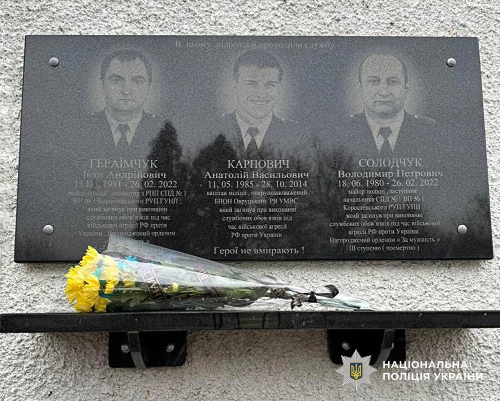 Сьогодні, у другі роковини трагедії, поліцейські відділу поліції №1 (м. Овруч) Коростенського райуправління вшанували пам'ять колег хвилиною мовчання та покладанням квітів до меморіальної дошки на їхню честь.