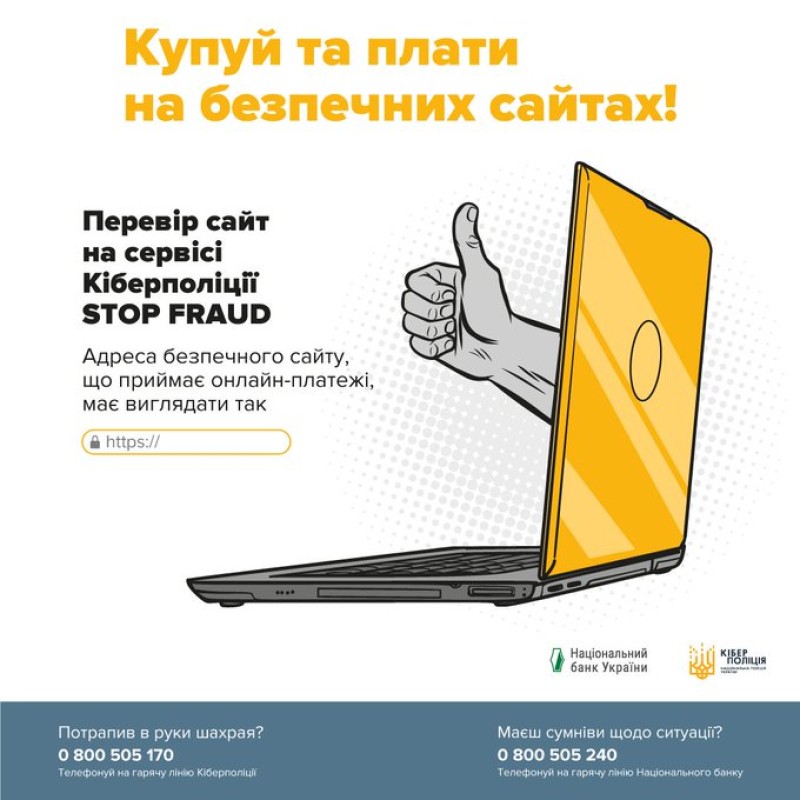 - купуючи онлайн, перевіряйте сайти за допомогою сервісу Кіберполіції STOP FRAUD або сервісу Асоціації «ЄМА». Також ви можете перевіряти відгуки щодо надійних сайтів, продавців та віртуальних магазинів через пошукові системи;