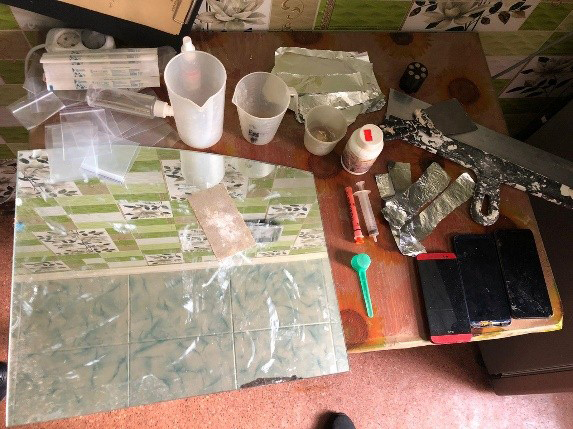 Днями поліцейські провели санкціоновані слідчі дії у житлових приміщеннях, пов’язаних із учасниками злочинної групи. У результаті обшуків вилучили докази протиправної діяльності: обладнання для виготовлення наркотиків і психотропів, рослинну нарковмісну сировину і синтетичний порошок у згортках та інші речі.