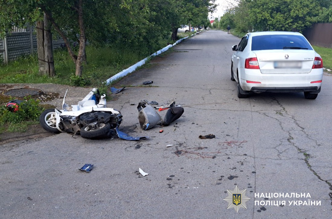У селищі відбулося зіткнення автомобіля «Skoda Octavia», під керуванням 27-річного киянина, та мопеда «Honda DIO», яким їхали двоє неповнолітніх.