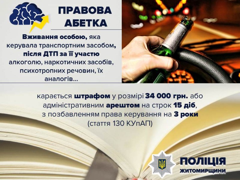 Нагадуємо, що вживання особою, яка керувала транспортним засобом, після ДТП за її участю алкоголю, наркотичних засобів, психотропних речовин, їх аналогів тягне за собою накладення штрафу на водіїв у розмірі 34 000 гривень або адміністративний арешт на строк 15 діб, з позбавленням права керування транспортними засобами на строк 3 роки (ч. 4 ст. 130 КУпАП).