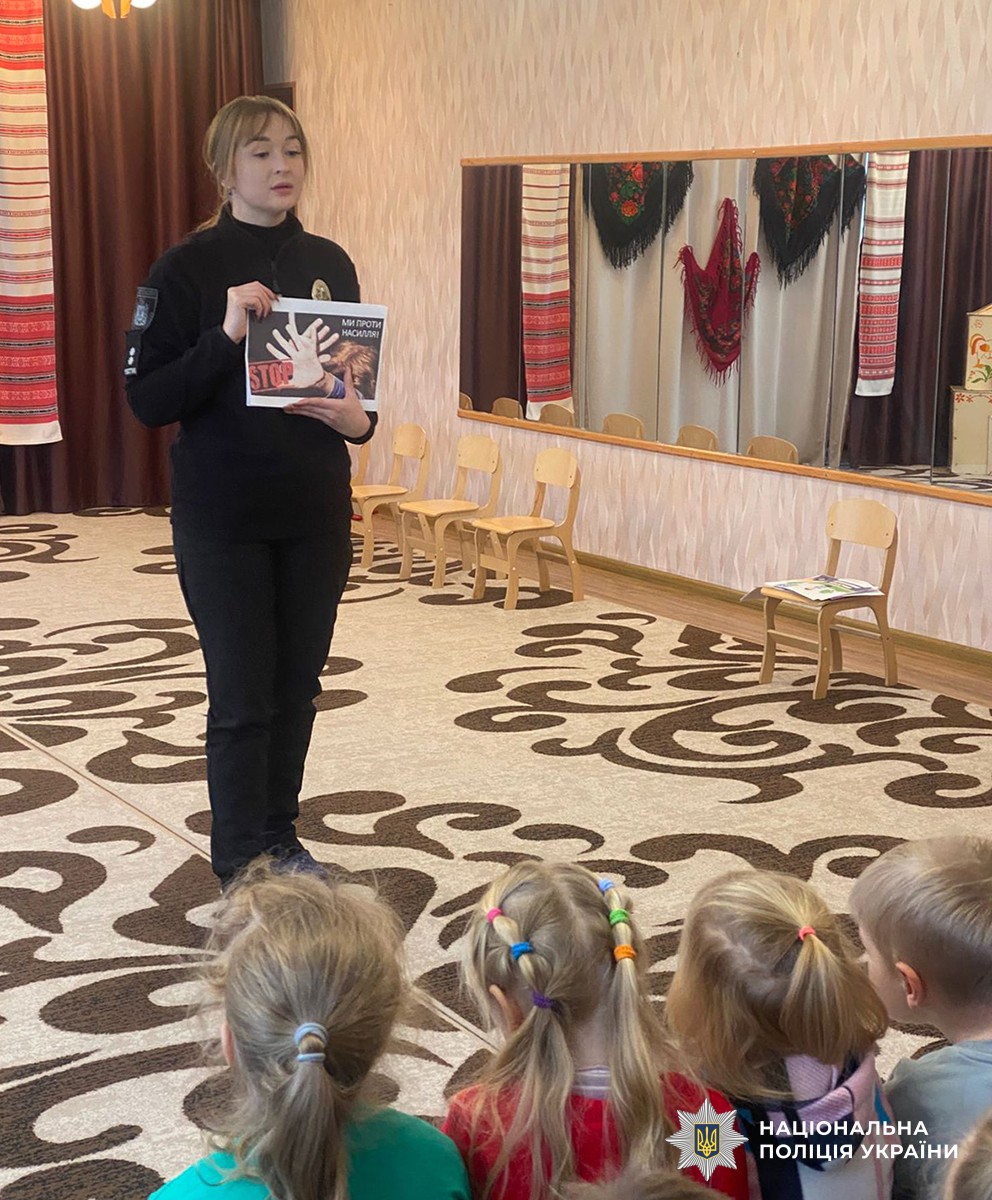 Поліцейська розповідала дітлахам про різні прояви насильства у доступній для них формі. Малеча дізналася, чому не слід ображати чи штовхати однолітків і до кого можна звернутися за допомогою у разі потреби.