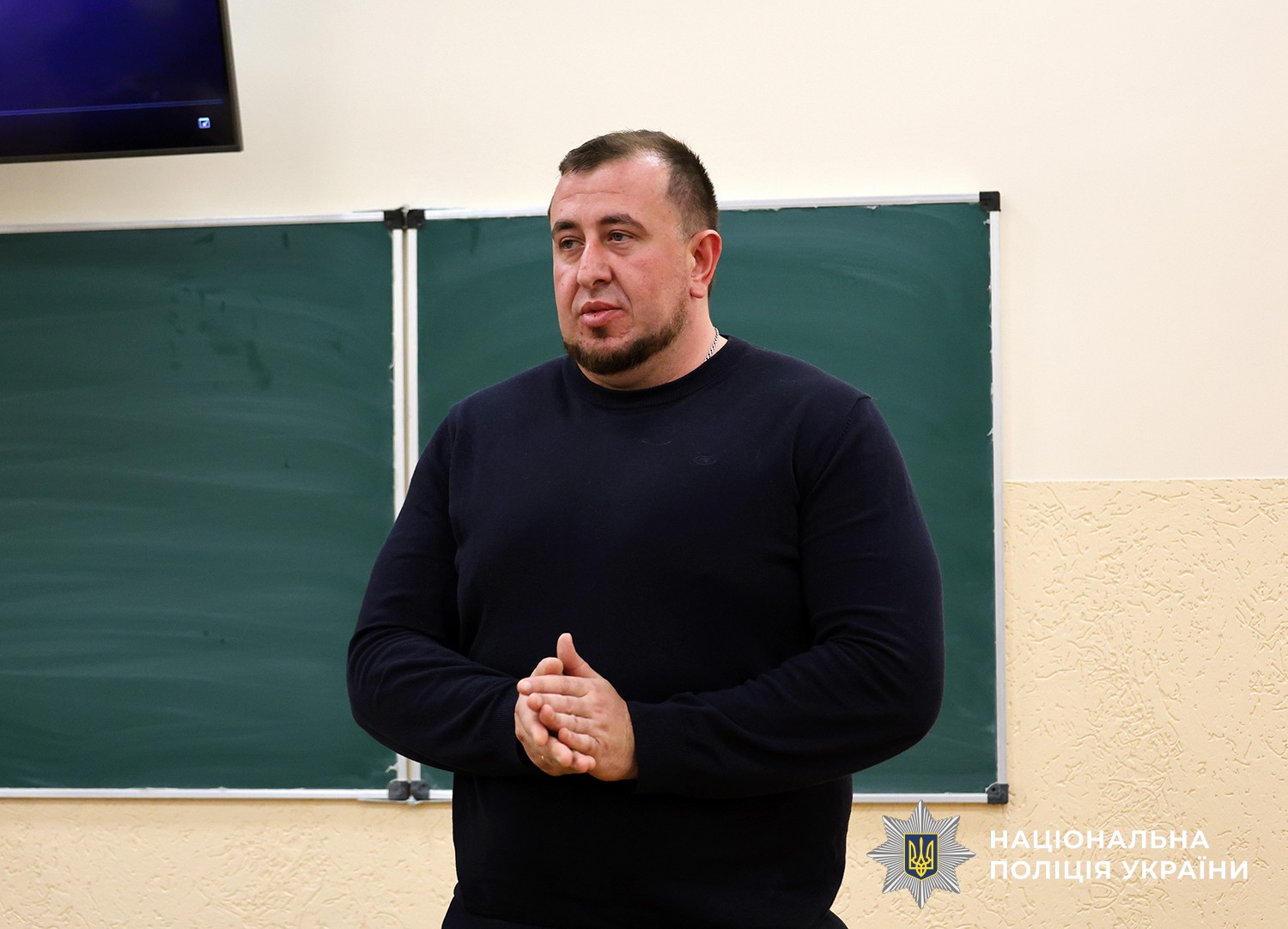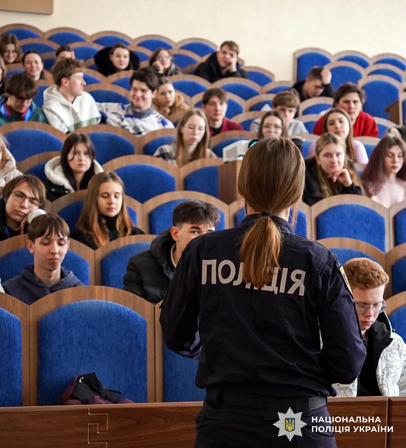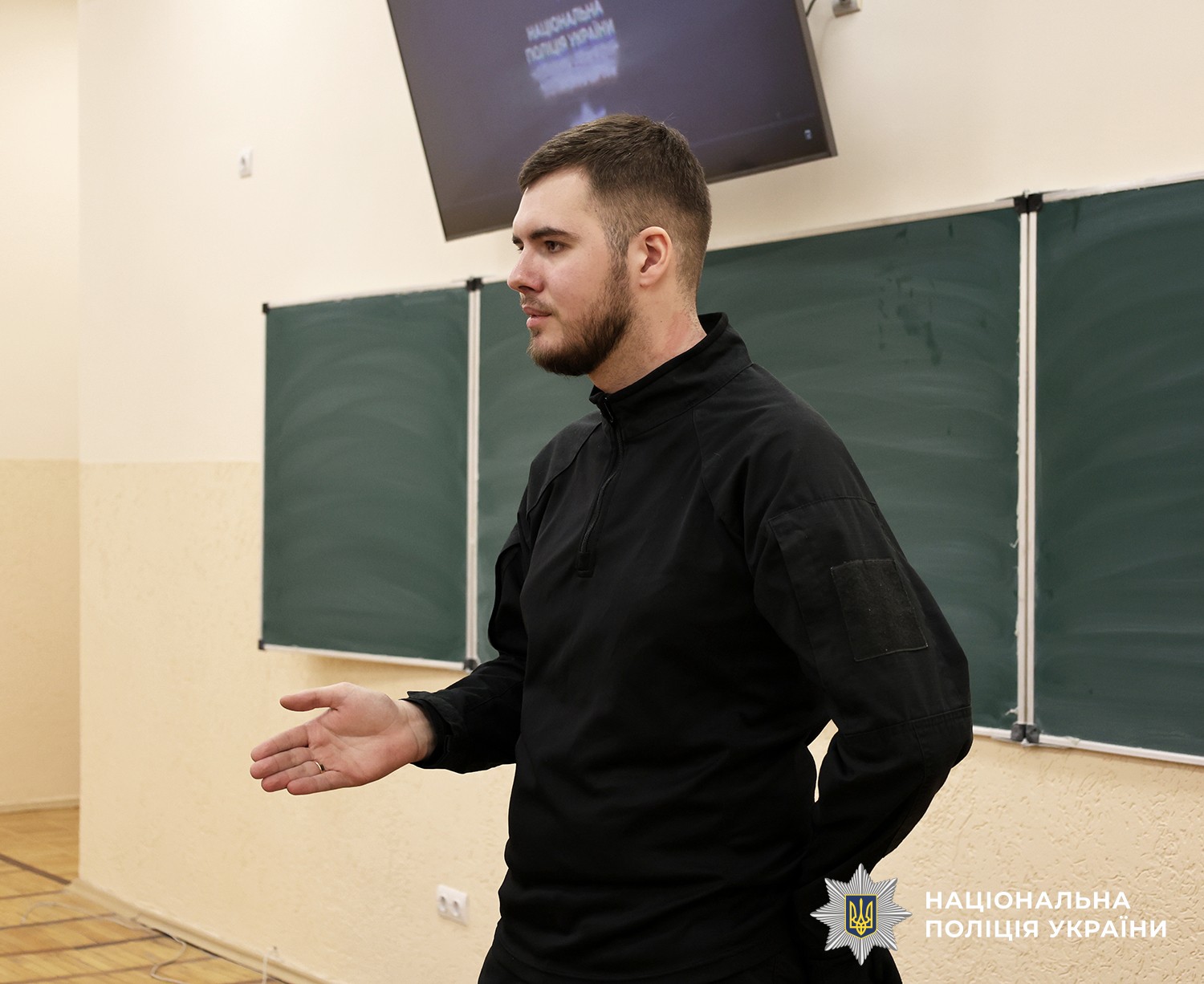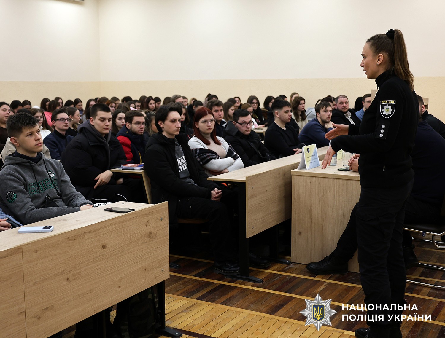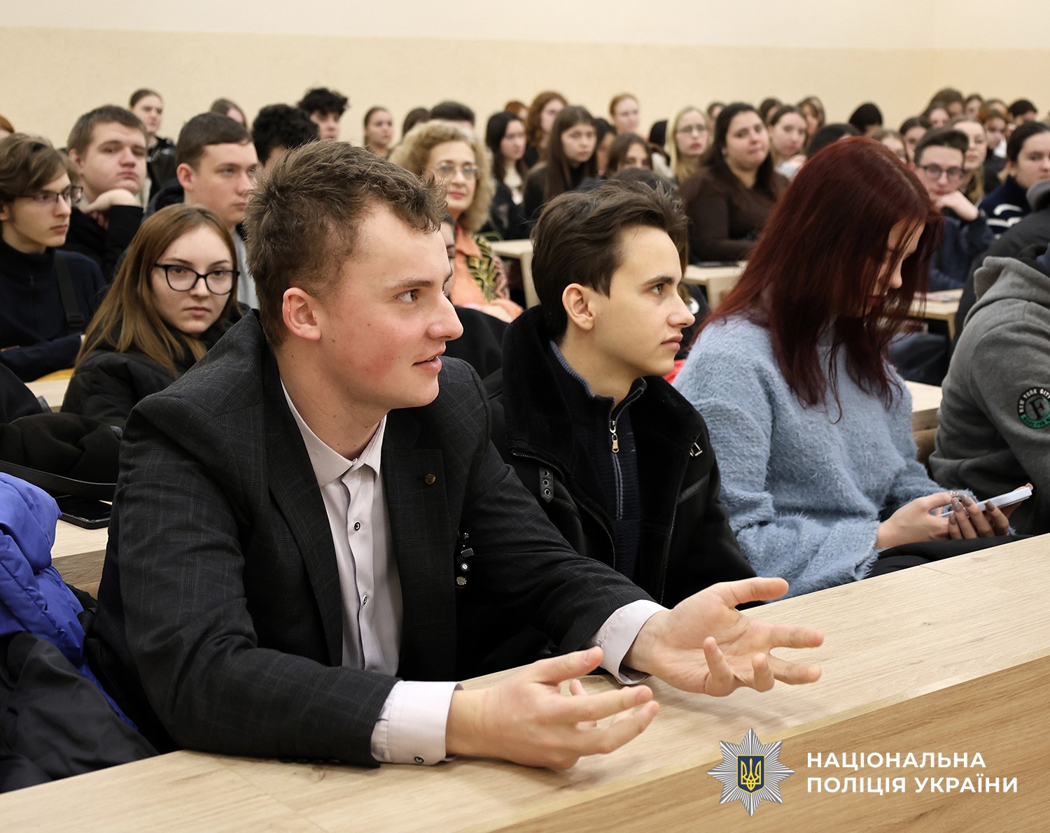 Зі студентами спілкувалися ветерани війни – помічник начальника ГУНП в області з ветеранської політики Кирило Гиндич і працівник Управління інформаційно-аналітичної підтримки ГУНП Олександр Неголюк, а також начальниця ювенальної превенції управління превентивної діяльності ГУНП Марія Зуб.