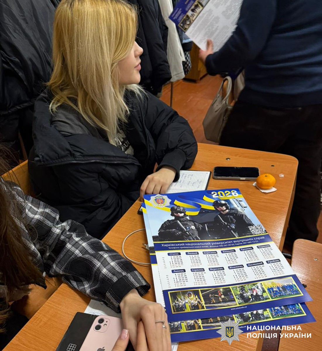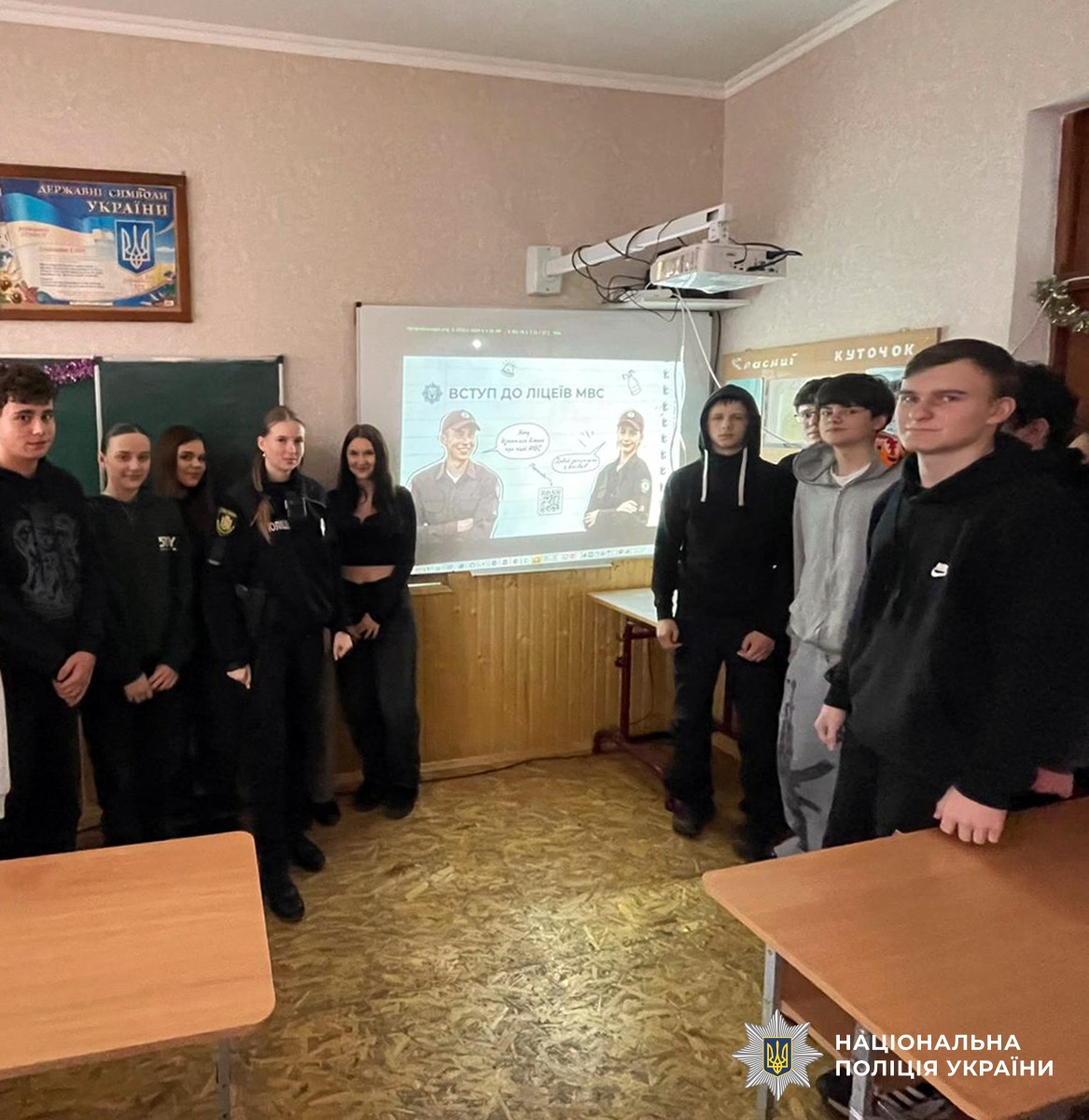 Учням детально розповіли про умови вступу до ліцеїв із посиленою поліцейською підготовкою МВС та навчання у Харківському національному університеті внутрішніх. Старшокласники дізналися про спеціальності, тривалість здобуття освіти, особливості підготовки майбутніх поліцейських, можливості подальшої служби та соціальні гарантії для курсантів.