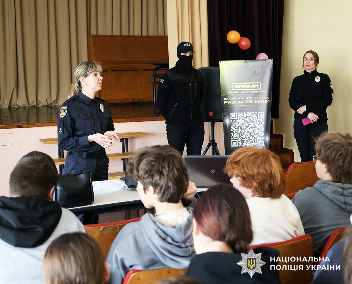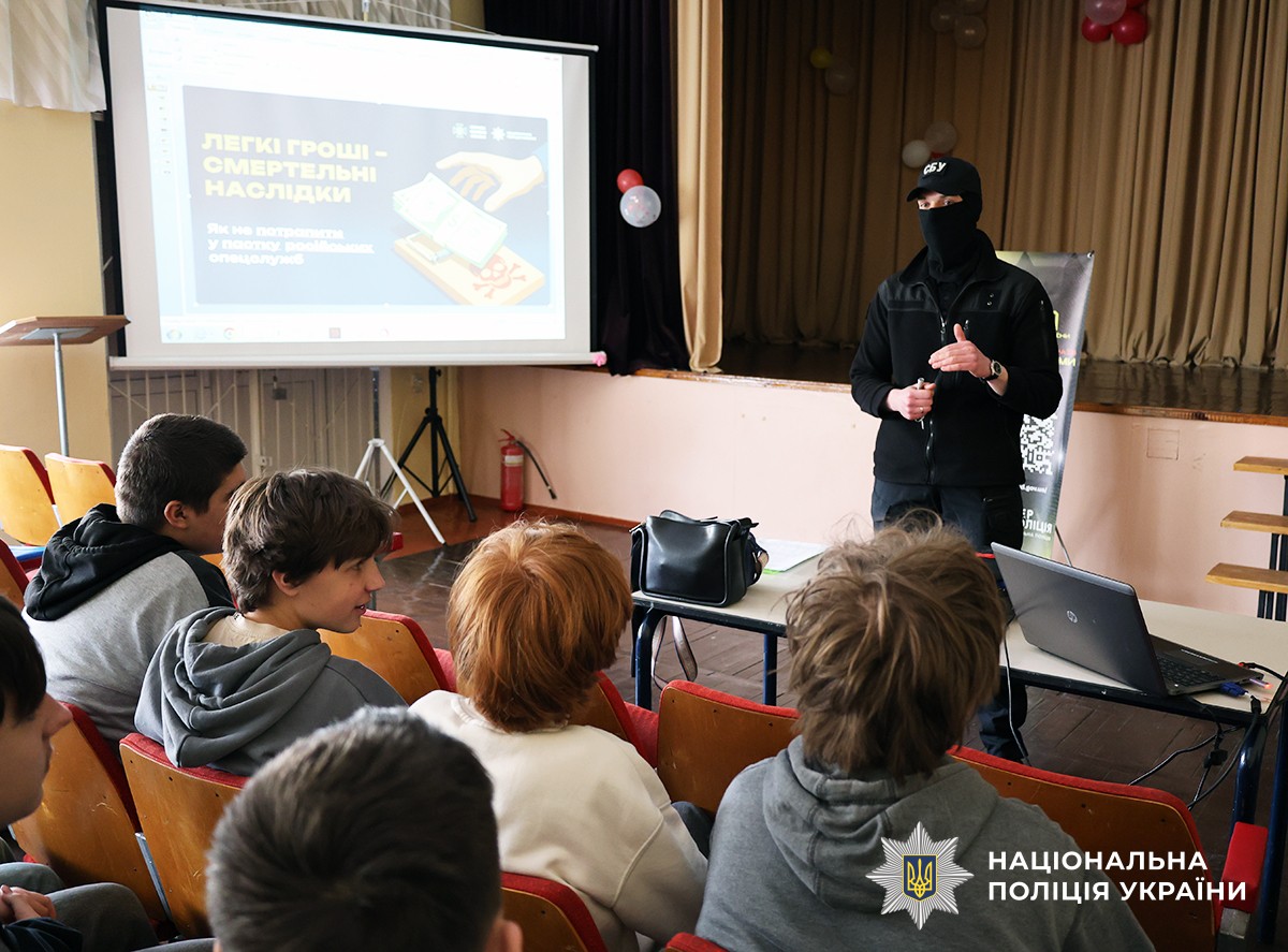 Діти та вчителі переглянули кілька тематичних відероликів. Вони отримали інформацію про те, як правильно діяти в разі надходження підозрілих пропозицій легкого заробітку або інших завдань. Також присутнім розповіли про функціонування проєкту кіберполіції «BRAMA» та месенджера СБУ «Не пали своїх – спали ворога». Додатково всім нагадали про номери телефонів, за якими можна звернутися до правоохоронних органів.
