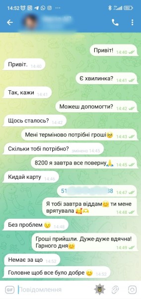 В таку аферу потрапила 32-річна містянка, яка отримала у месенджері «Telegram» від подруги прохання позичити 8200 гривень. Тож жінка без вагань зробила переказ на вказану у повідомленні картку. А згодом зв’язалася з подругою та дізналась, що насправді вона не потребувала такої допомоги. Нині поліцейські встановлюють причетних до шахрайства.
