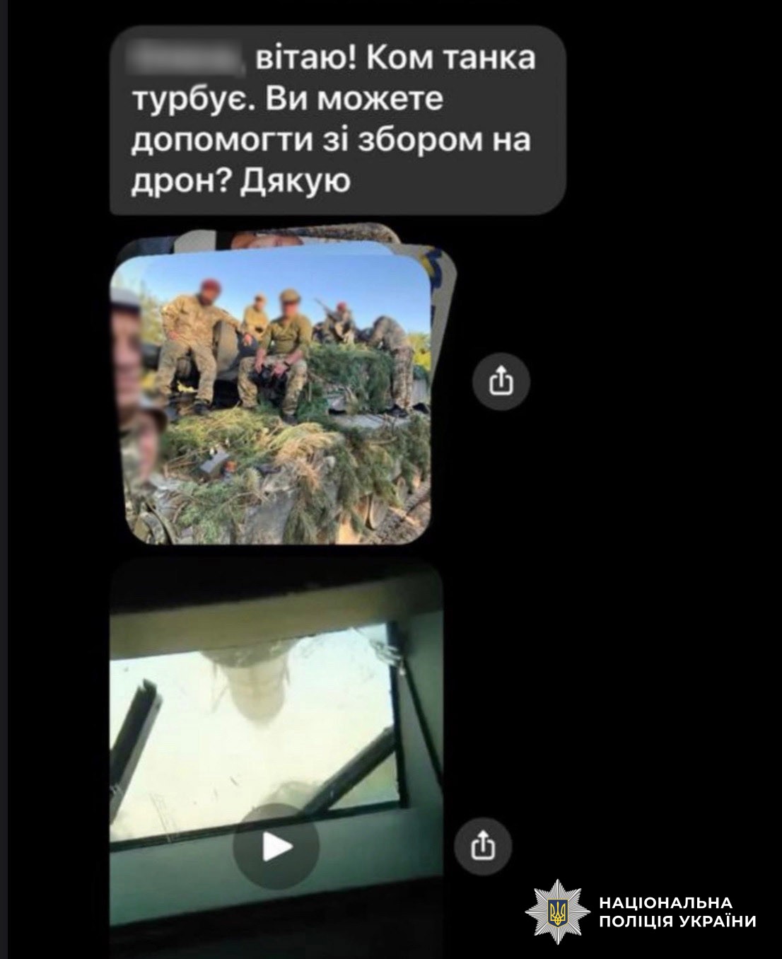 Правоохоронці з'ясували, що фігурант звернувся у месенджері до волонтерки, назвавшись командиром танка. Він просив допомогти зібрати гроші на дрон для виконання бойових завдань. Для переконливості надіслав відео, де перебував в однострої разом з побратимами.