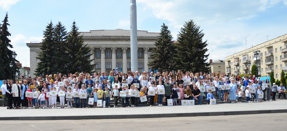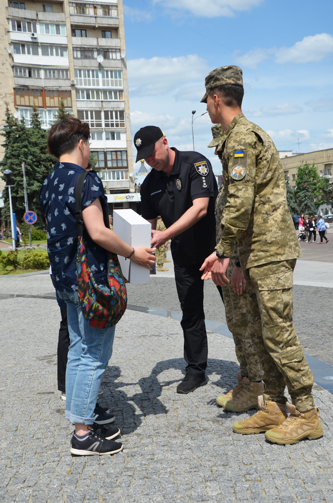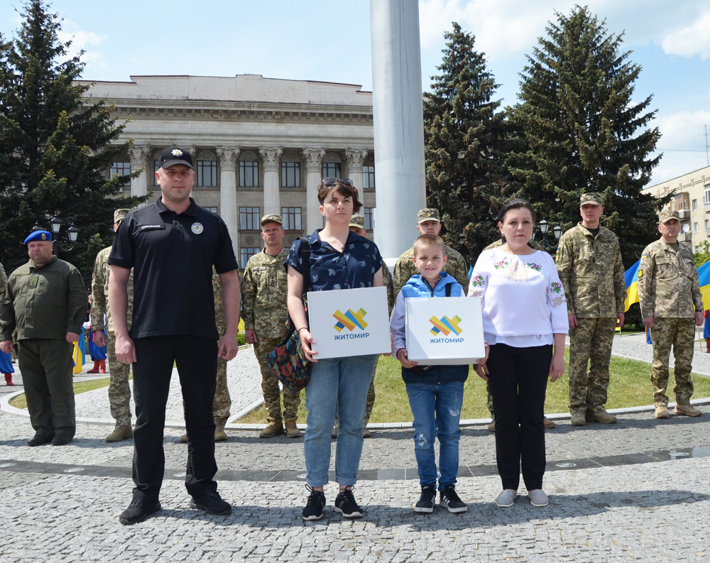 Також біля Державного Прапора України працівники поліції разом із представниками органів місцевої та обласної влади вручили подарунки всім дітям, жителям Житомирської громади, батьки яких загинули у протистоянні з ворогом.