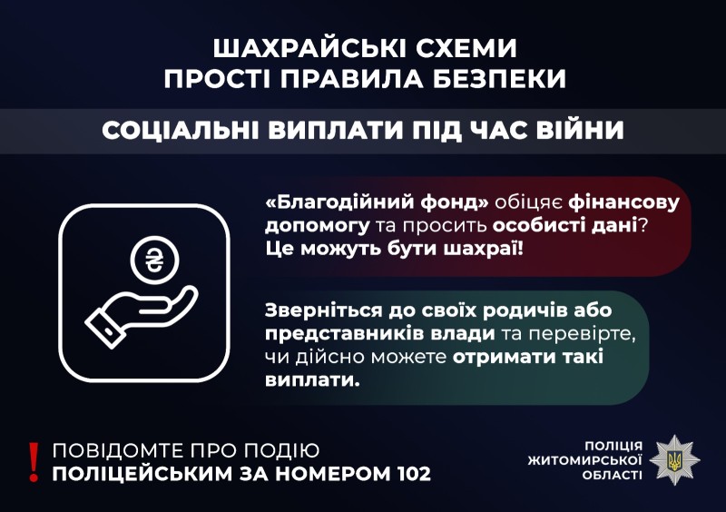 Днями до Житомирського райуправління поліції №1 з повідомленням про ошуканство звернулась 58-річна жінка. Сподіваючись отримати матеріальну допомогу, вона втратила близько 150 тисяч гривень з особистого рахунку.