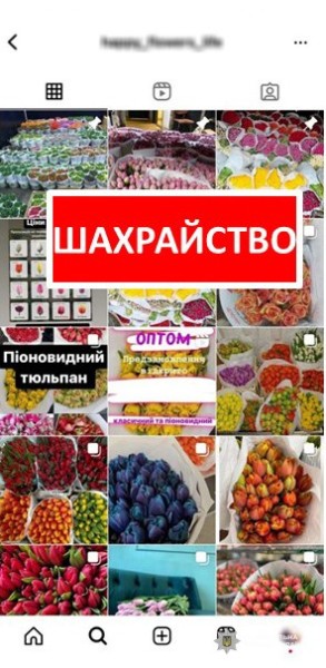 Поліцейським заявниця розповіла, що 1 березня в соціальній мережі «Instagram» знайшла сторінку гуртової торгівлі квітами. У листуванні «флорист» запропонував тюльпани за вкрай вигідною ціною. Жінка без вагань замовила 1600 рослин та сплатила понад 23 000 гривень, які відразу перерахувала на вказану співрозмовником банківську картку.