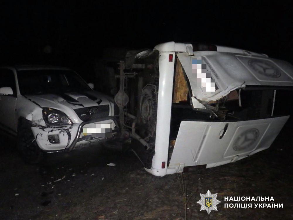 Попередньо, 41-річний житель Полтавщини, керуючи автомобілем «Chery Tiggo», при здійсненні обгону з виїздом на зустрічну смугу руху, зіткнувся з пасажирським мікроавтобусом «Mercedes Sprinter» під керуванням 54-річного жителя м. Звягеля, який рухався в попутному напрямку. Від удару мікроавтобус перекинувся на бік.