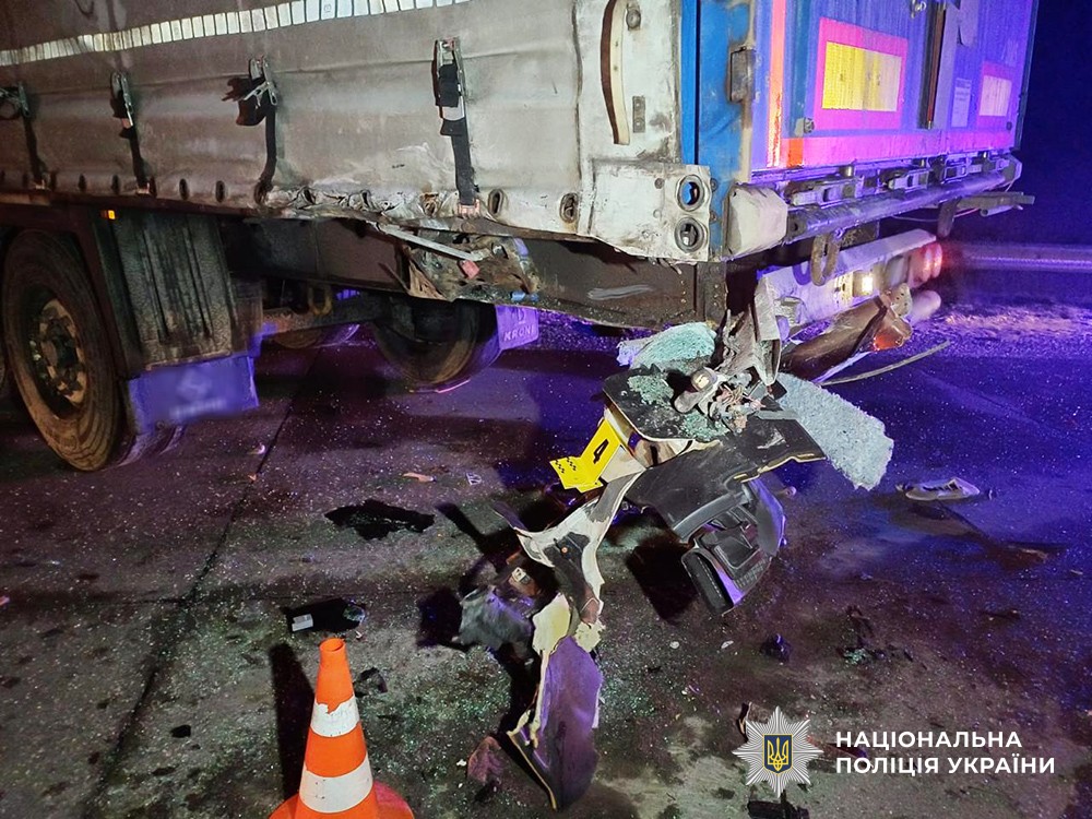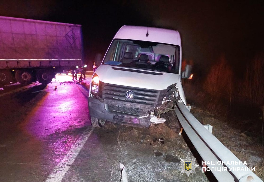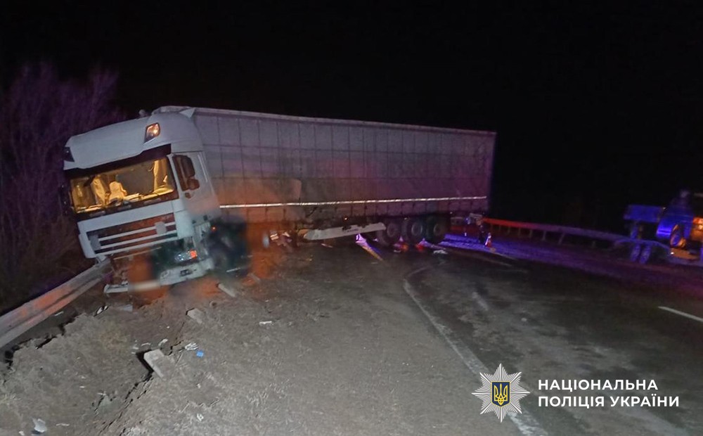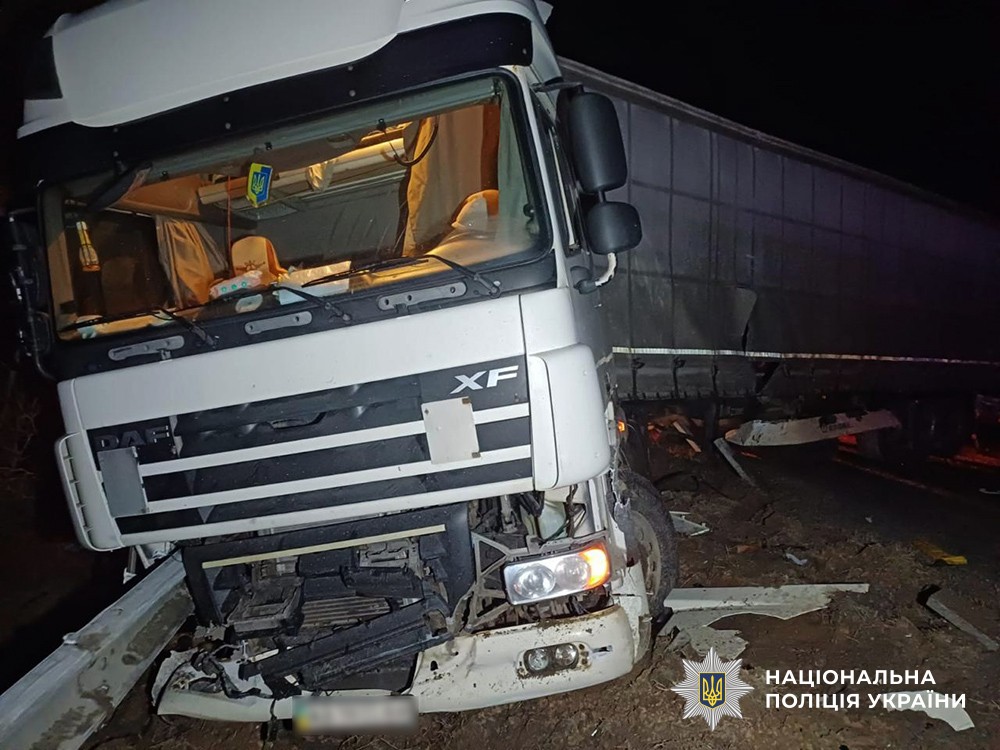 Попередньо, 45-річний водій, житель Київської області, керуючи вантажним автомобілем «DAF» з напівпричепом «KRONE», допустив занос та виїхав на смугу зустрічного руху, де зіштовхнувся з металевою огорожею. Внаслідок цього задня частина напівпричепа перекрила дорогу.
