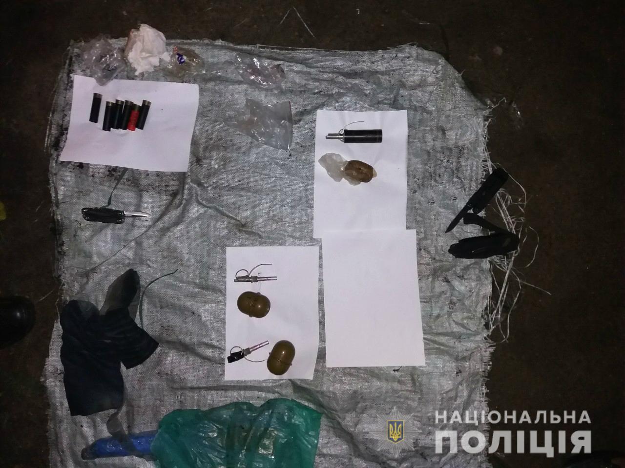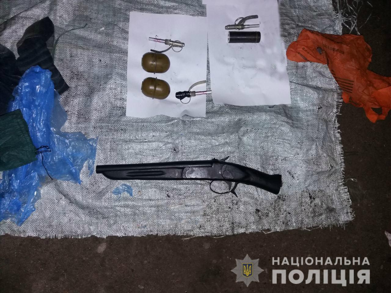 Під час огляду у мішку поліцейські-вибухотехніки виявили гранати РГД-5 та ВОГ-17 з підривачами типу УЗРГМ і фрагмент пластичної вибухової речовини. Окрім того, у ноші знаходились обріз одноствольної мисливської рушниці калібру 16 мм та відповідні набої.
