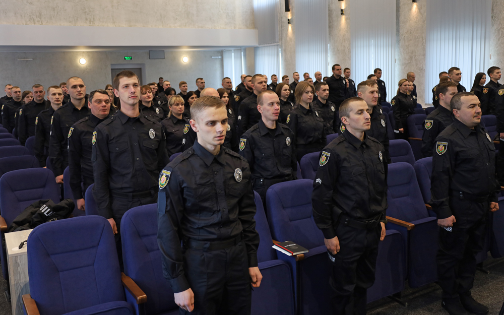 79 поліцейських сьогодні, 10 лютого, у Головному управлінні Нацполіції в області склали Присягу на вірність українському народові. Це перші слухачі, які за час повномасштабного вторгнення рф пройшли конкурсний відбір та розпочнуть опановувати фах правоохоронця у Житомирській академії поліції.