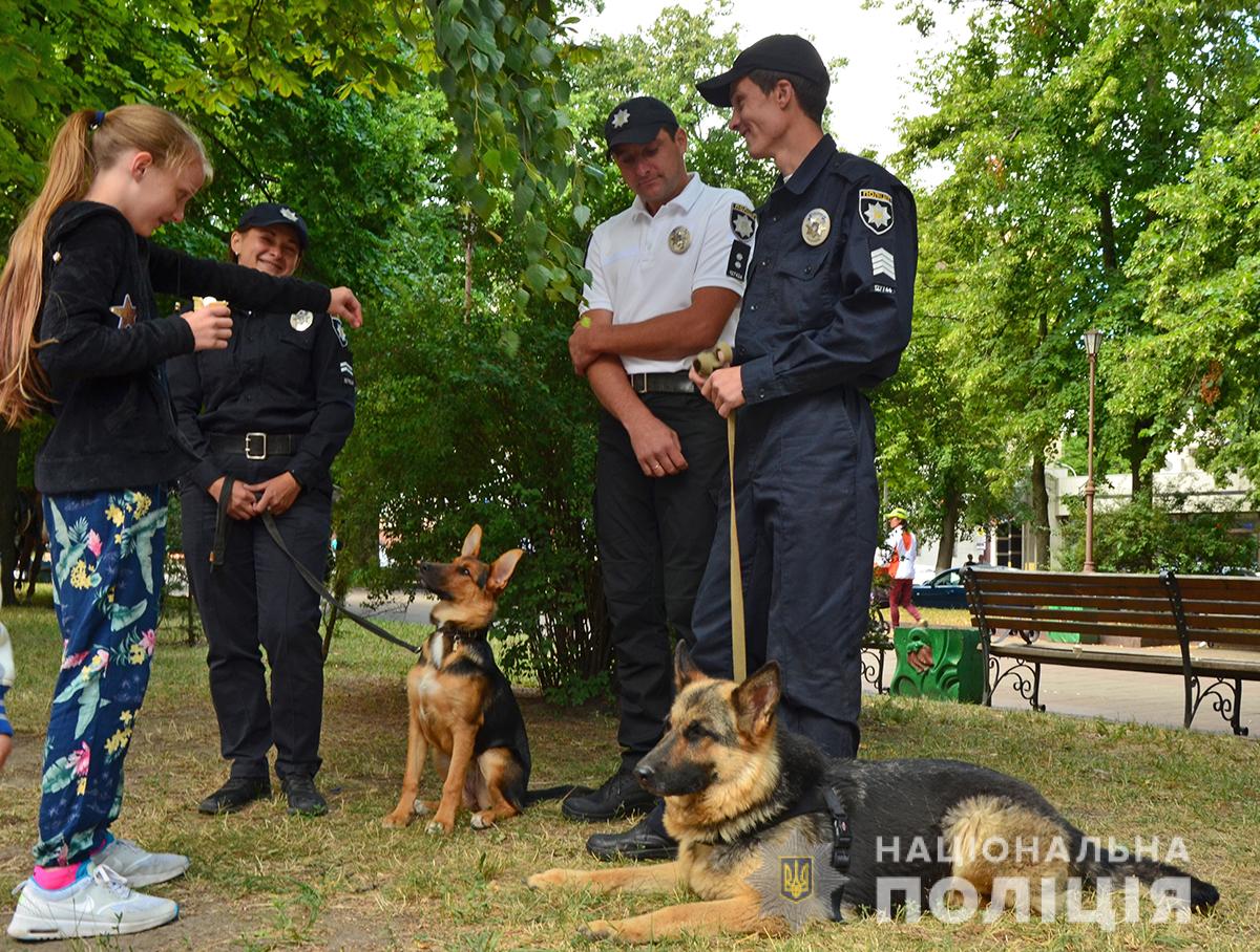 На кінологічній локації малеча бавилась із дружелюбними службовими собаками, а їх господарі-кінологи розповіли усім бажаючим про особливості служби та дресури своїх чотирилапих помічників.