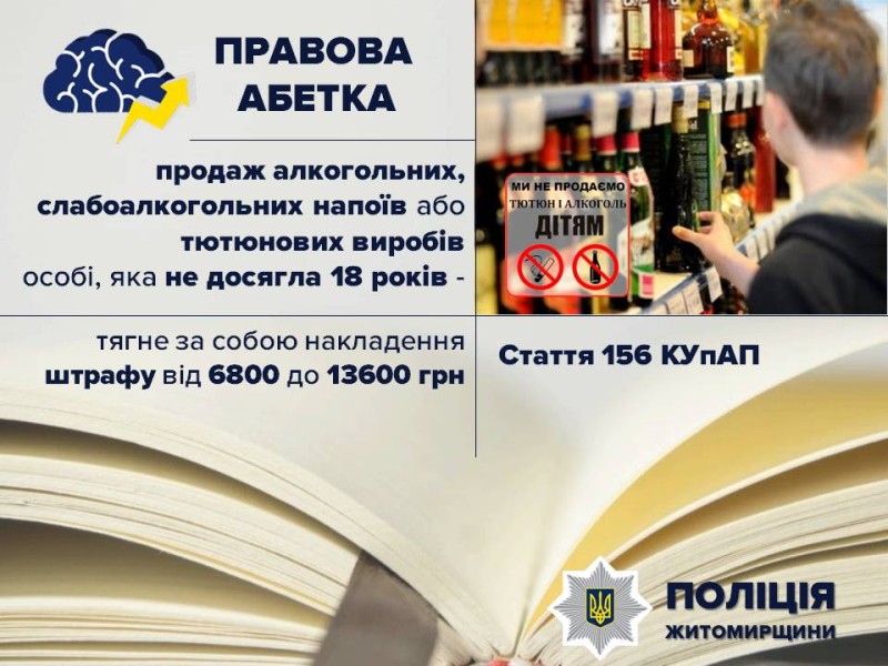 Правоохоронці нагадують, що відповідно до чинного законодавства, продаж пива (крім безалкогольного), алкогольних, слабоалкогольних напоїв, тютюнових виробів, електронних сигарет, рідин, що використовуються в електронних сигаретах, пристроїв для споживання тютюнових виробів без їх згоряння особі, яка не досягла 18-річного віку, тягне за собою накладення штрафу від 6800 до 13600 гривень.