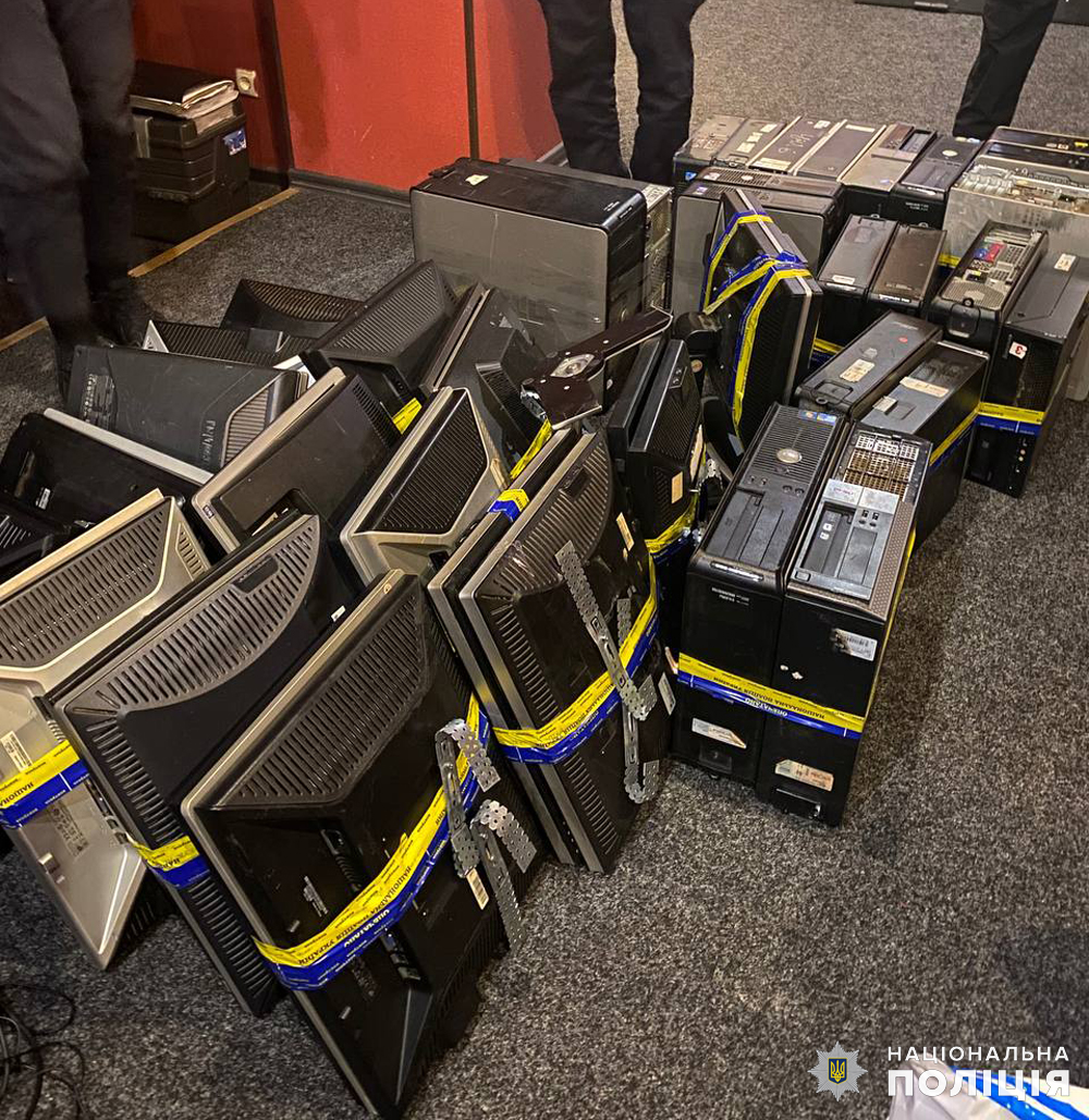 У ході проведених невідкладних слідчих дій з приміщення були вилучені понад 2 десятки комплектів комп’ютерної техніки, квитанції, апарати для перевірки грошових коштів і друку фіскальних чеків.