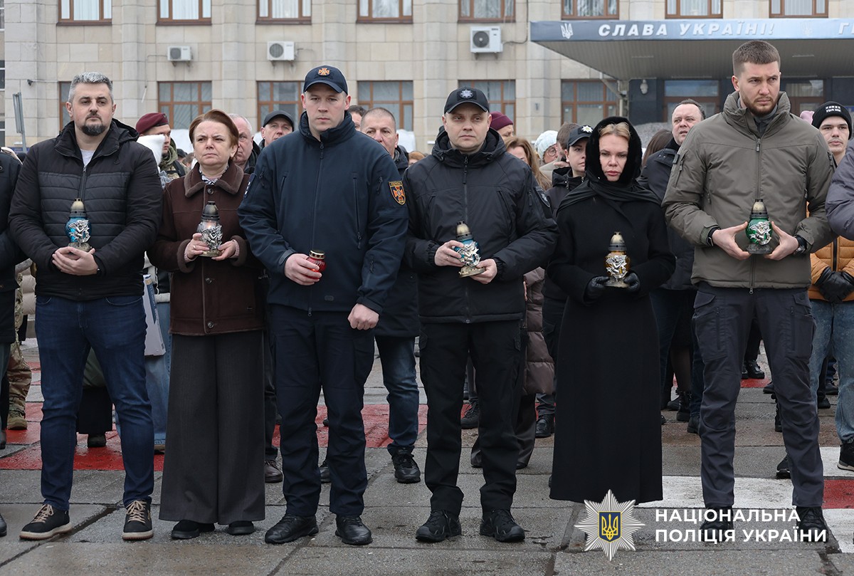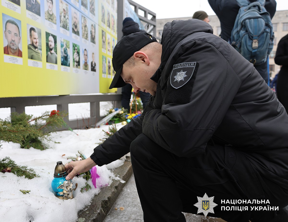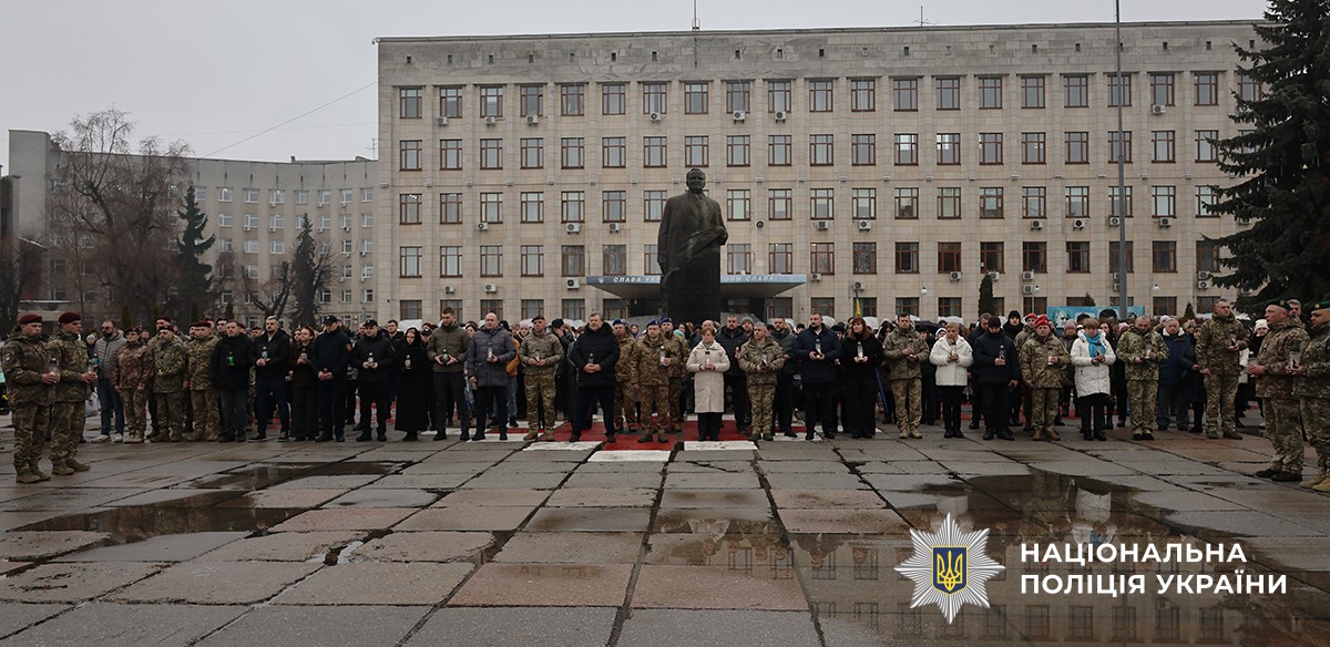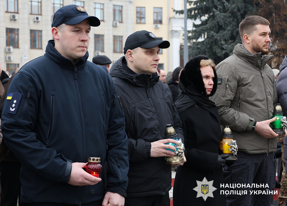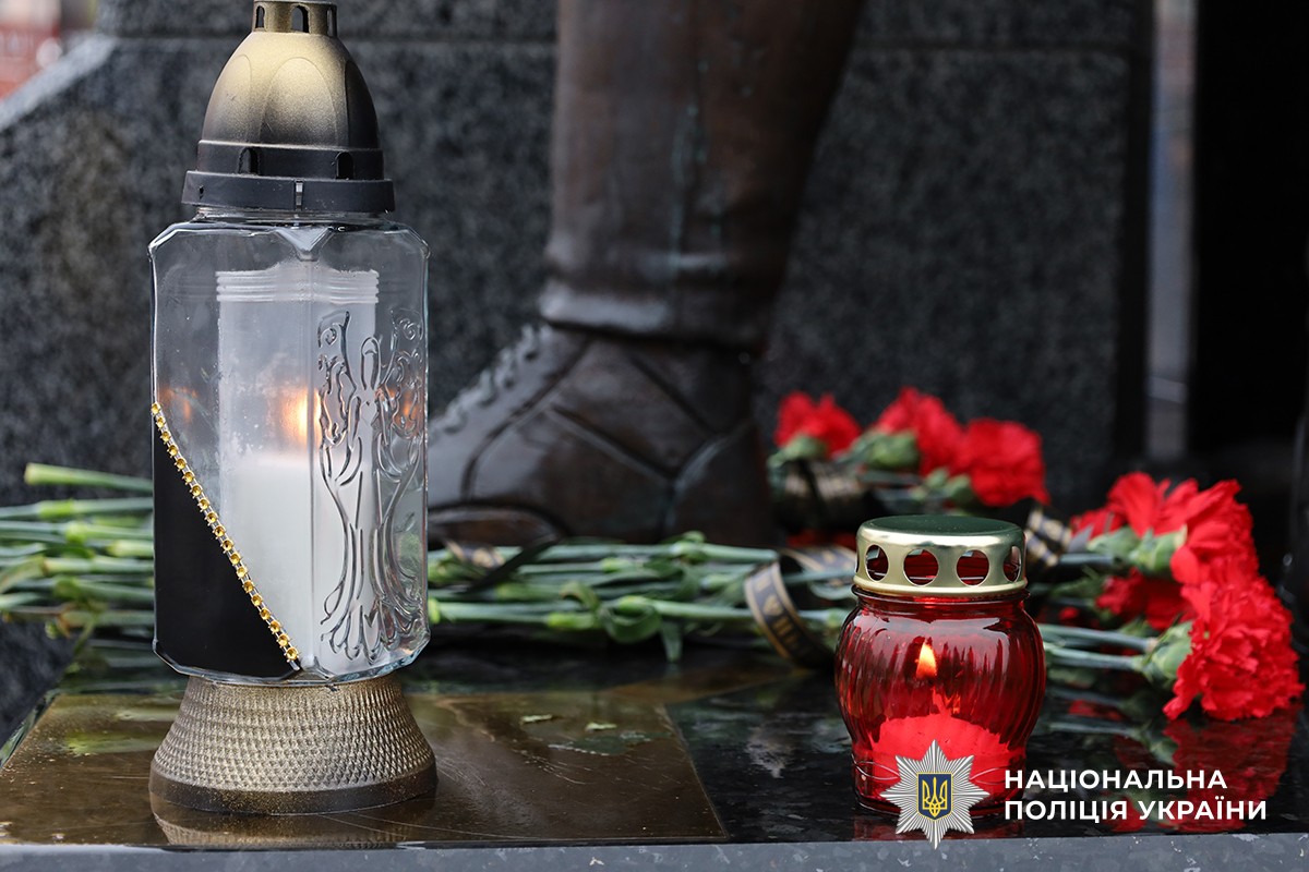 Начальник ГУНП у Житомирській області Олександр Ковтун разом із представниками обласної та міської влади, правоохоронцями, військовослужбовцями, родинами загиблих воїнів і жителями міста схилили голови у хвилині мовчання за тими, чиї життя забрала війна.