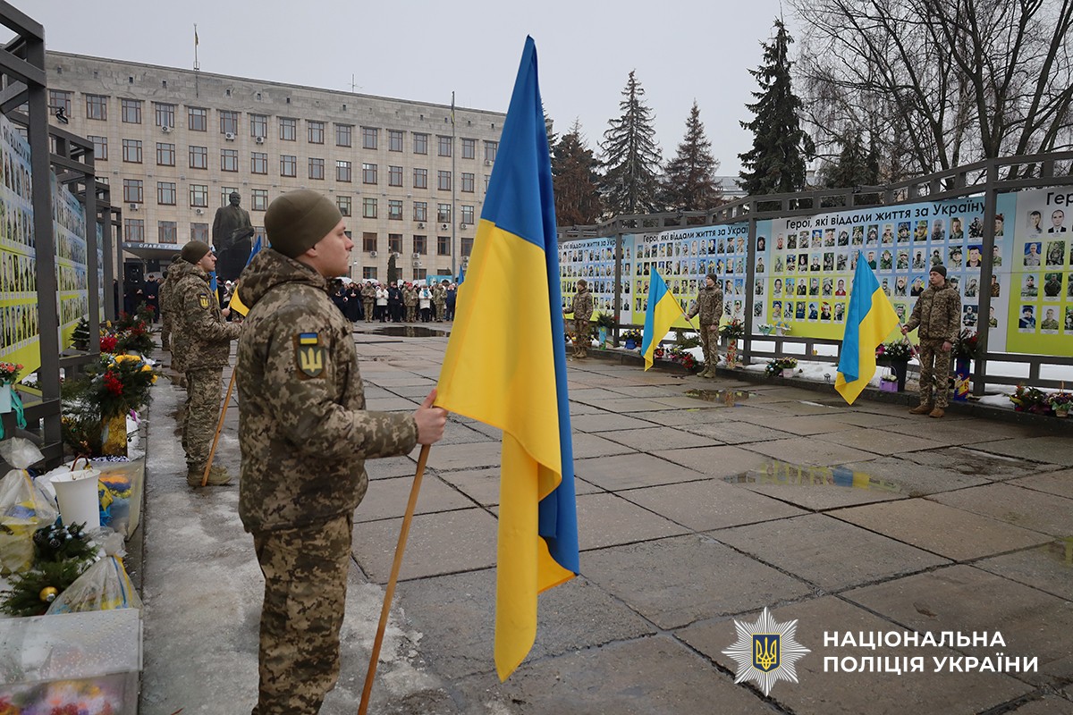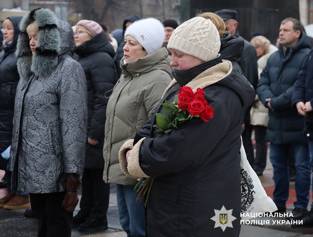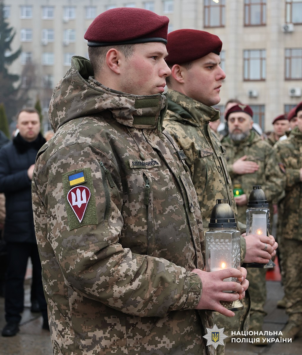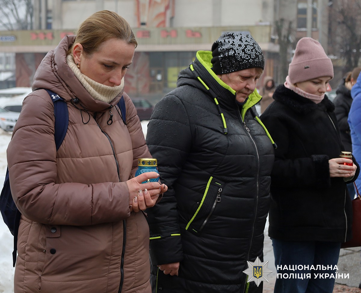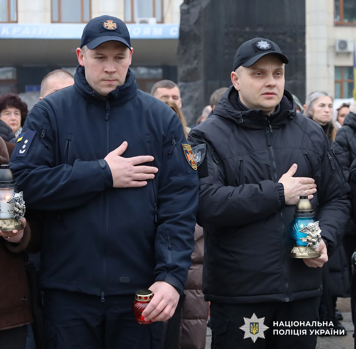 Начальник ГУНП у Житомирській області Олександр Ковтун разом із представниками обласної та міської влади, правоохоронцями, військовослужбовцями, родинами загиблих воїнів і жителями міста схилили голови у хвилині мовчання за тими, чиї життя забрала війна.