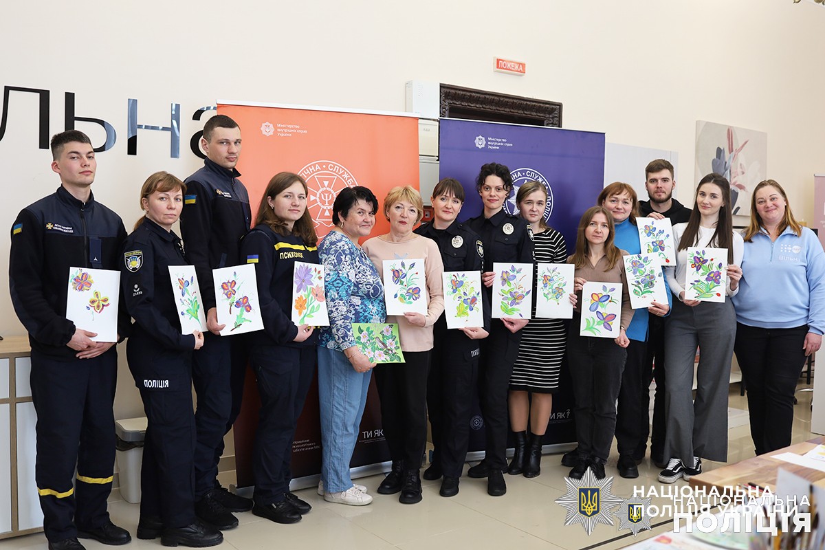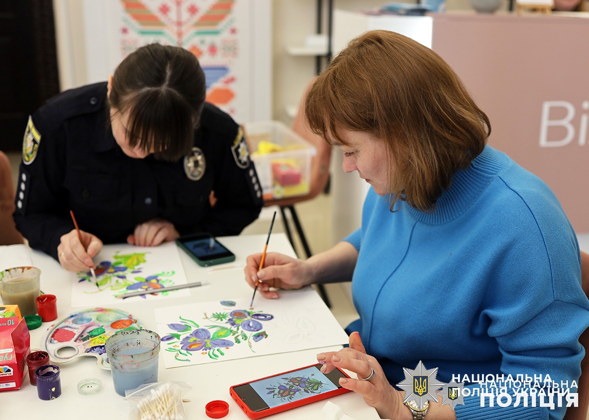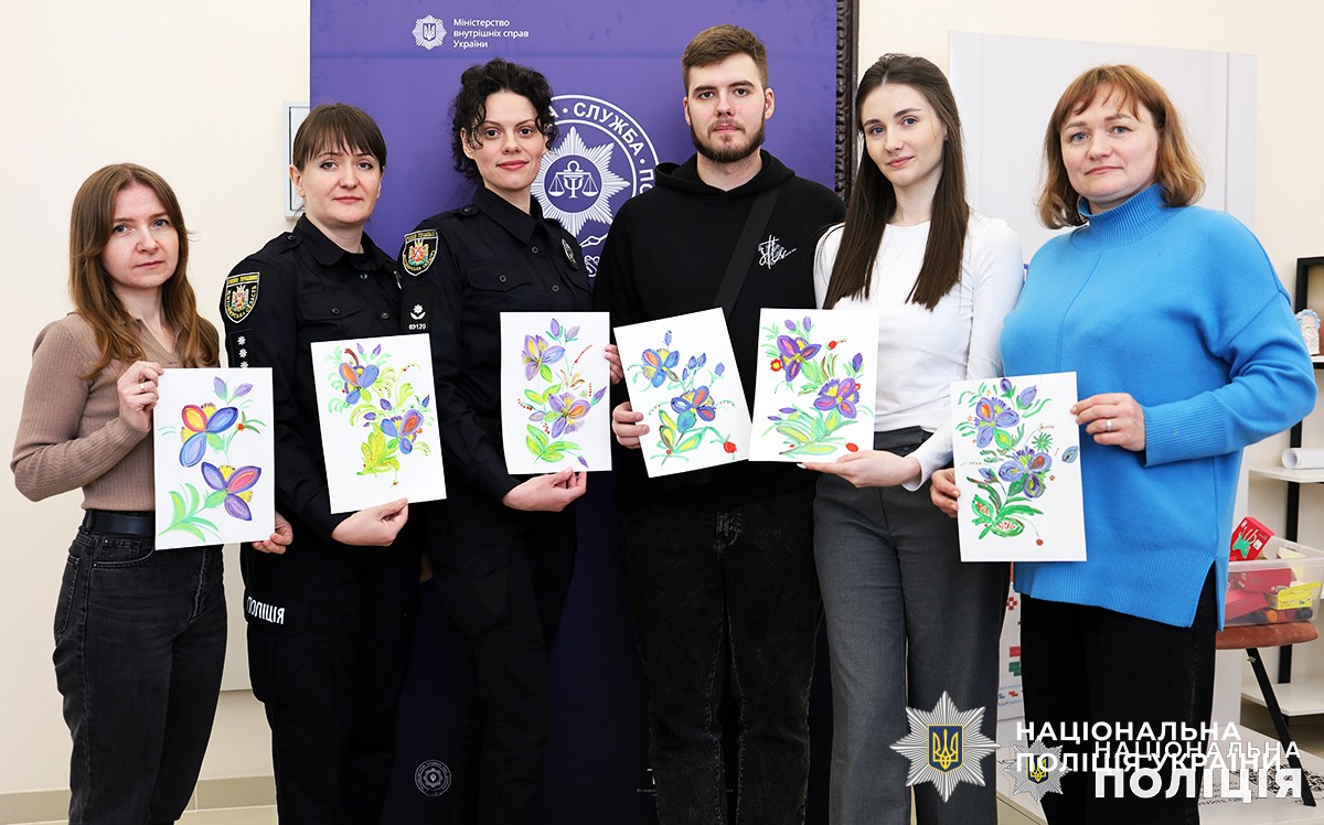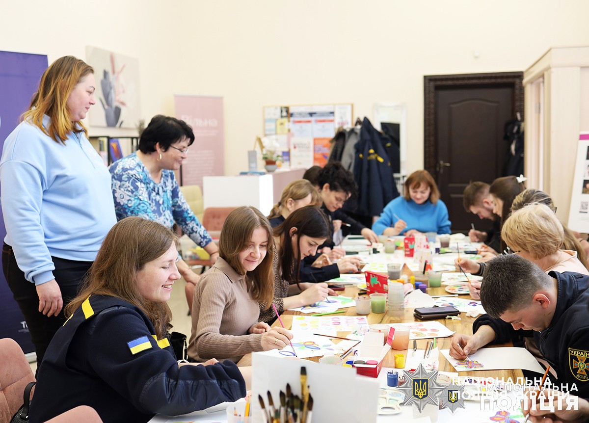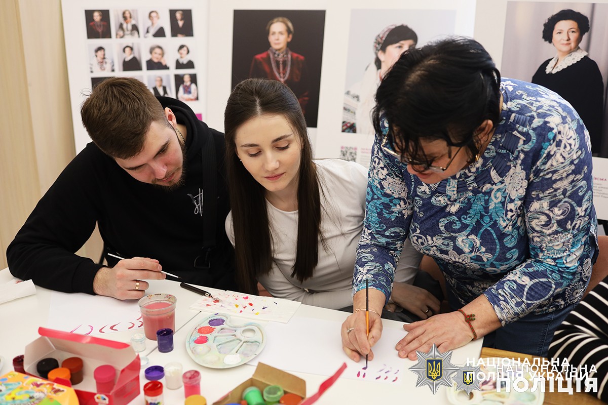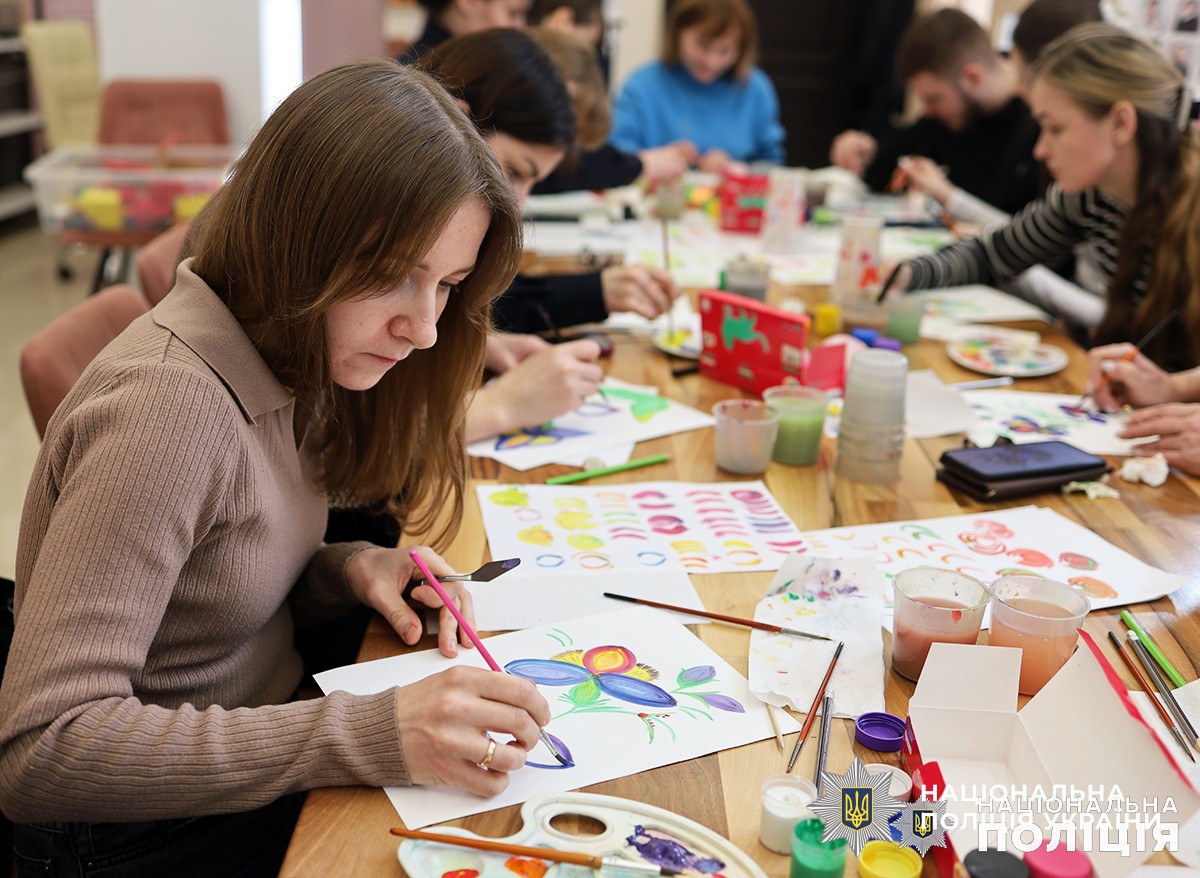 Учасниками мистецького майстер-класу стали поліцейська - дружина військовослужбовця та нові жителі обласного центру, які змушені були покинути рідні домівки у зоні бойових дій. До них приєдналися дружина загиблого поліцейського та працівники ДСНС, які повернулися із лінії фронту.