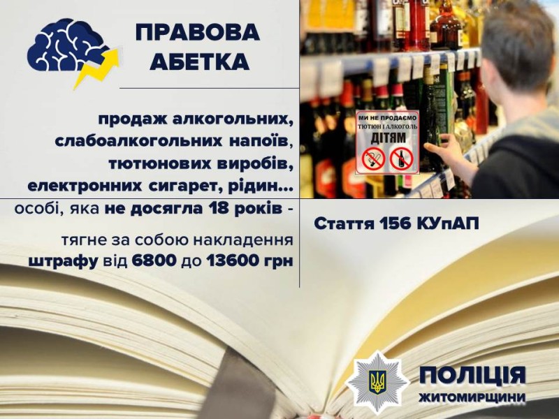 Ювенальні інспектори Житомирського районного управління поліції постійно моніторять ситуацію щодо неприпустимості продажу дітям алкогольних напоїв та тютюнових виробів. Упродовж тижня поліцейські задокументували такі порушення в обласному центрі, Оліївській, Попільнянській та Квітневій громадах. Нині усі матеріали скеровані до відповідних адміністративних комісій.