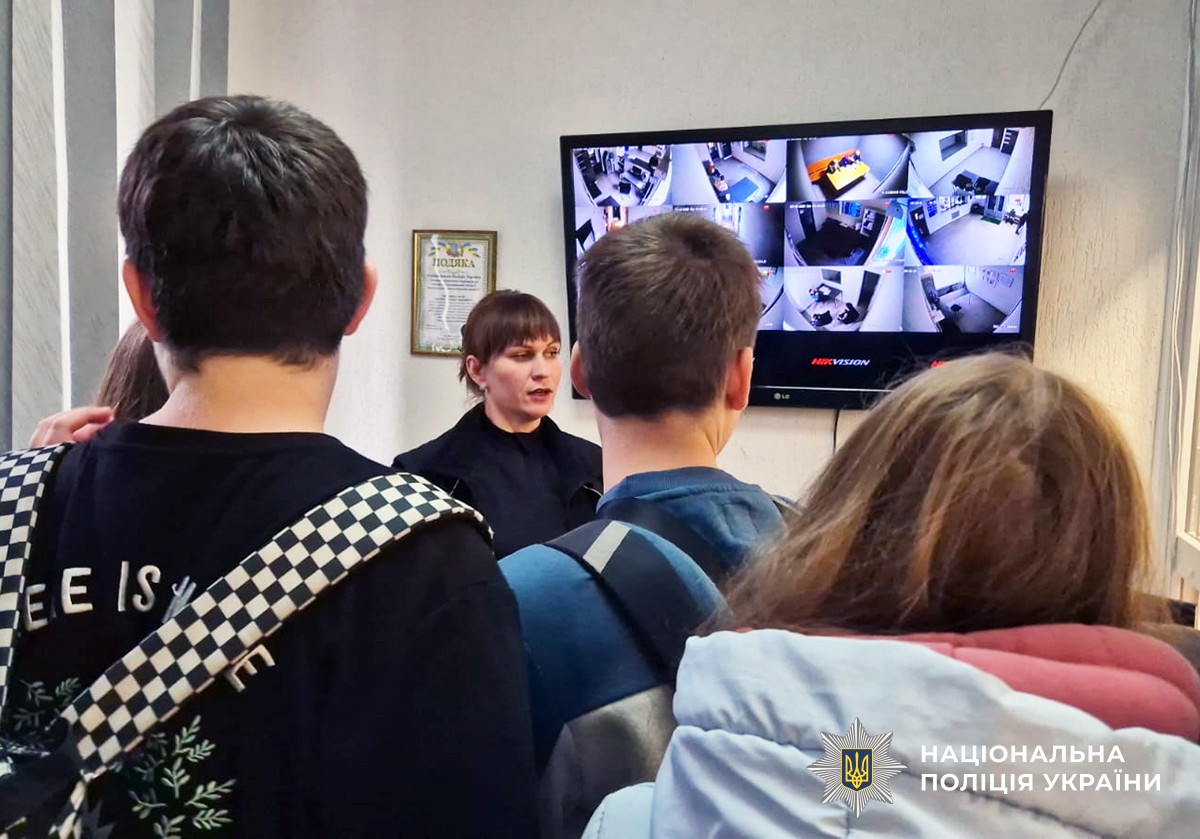 Зустріла гостей інспекторка з дотримання прав людини райуправління Оксана Карпінська. Вона розповіла дітям про структуру підрозділу, роботу чергової частини, поліцейського фронт-офісу та продемонструвала службові приміщення. Інспекторка також наголосила дітям, що в приміщенні цілодобово та безперервно проводиться фіксація всіх дій присутніх осіб, що є важливим кроком у дотриманні прав людини.